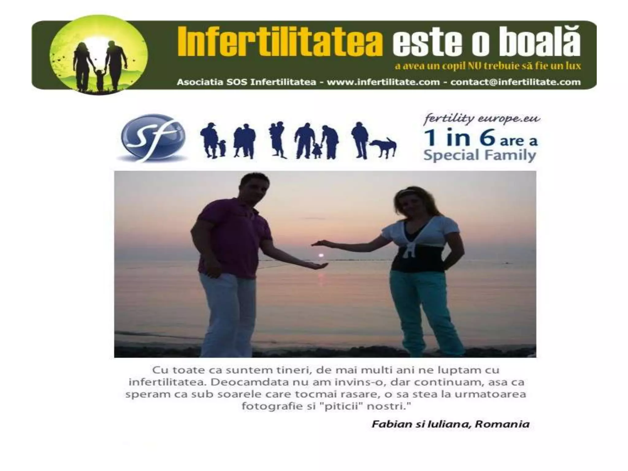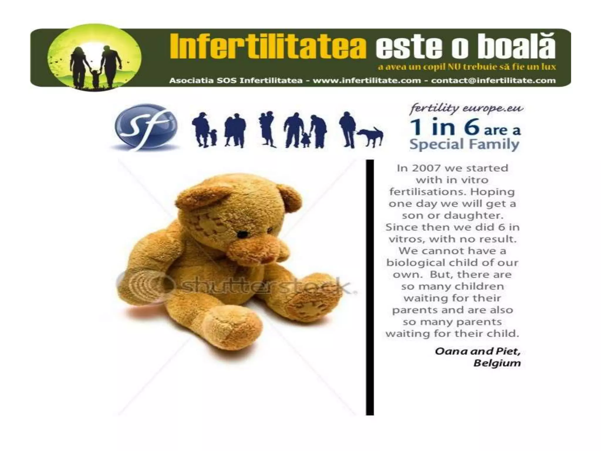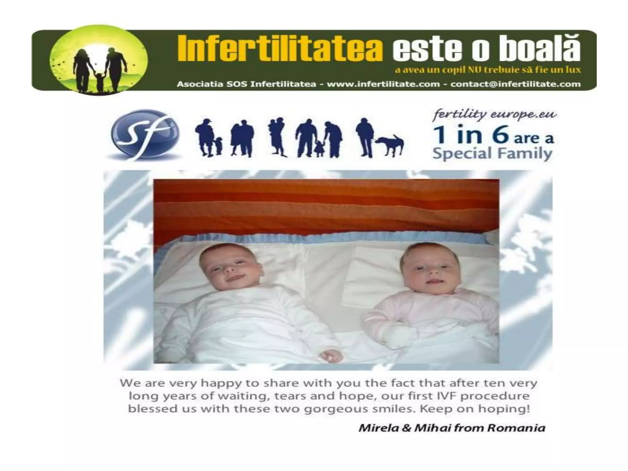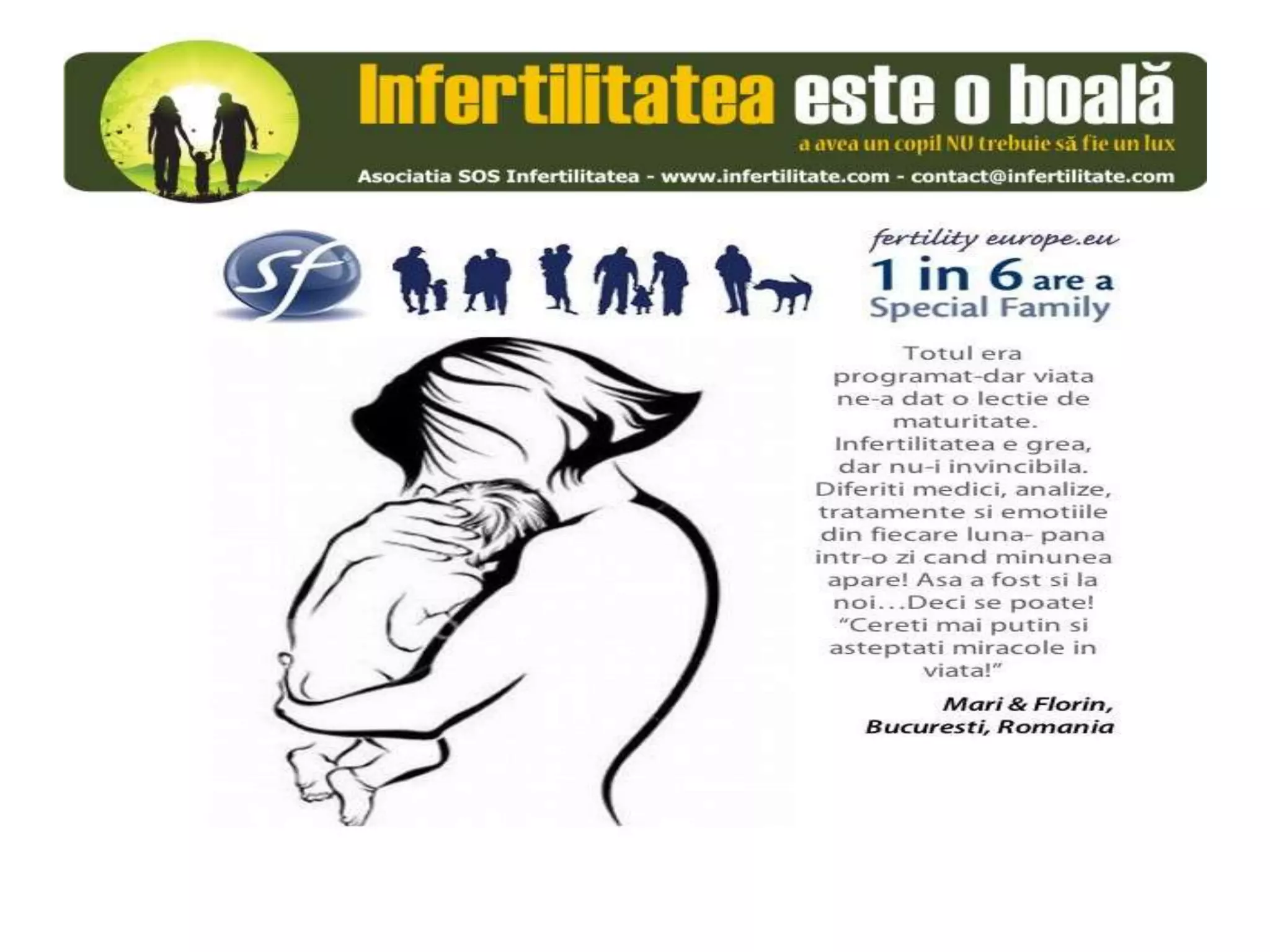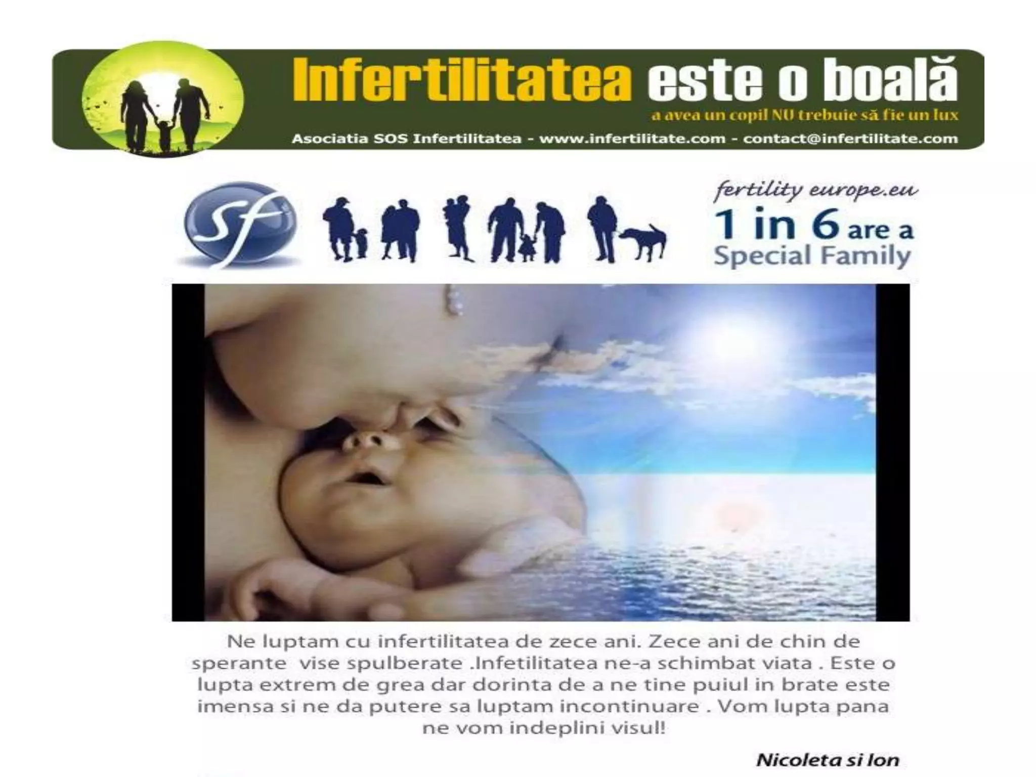 Unul din șase cupluri din Europa se confruntă cu probleme de fertilitate, afectând aproximativ 10 milioane de persoane care au nevoie de sprijin. Asociația SOS Infertilitate participă la o campanie paneuropeană subliniind impactul infertilității și desfășoară acțiuni de advocacy pentru conștientizarea acestei probleme. Organizația funcționează din donații și sponsorizări, fără angajați plătiți, și are ca obiectiv responsabilizarea clasei politice românești.
