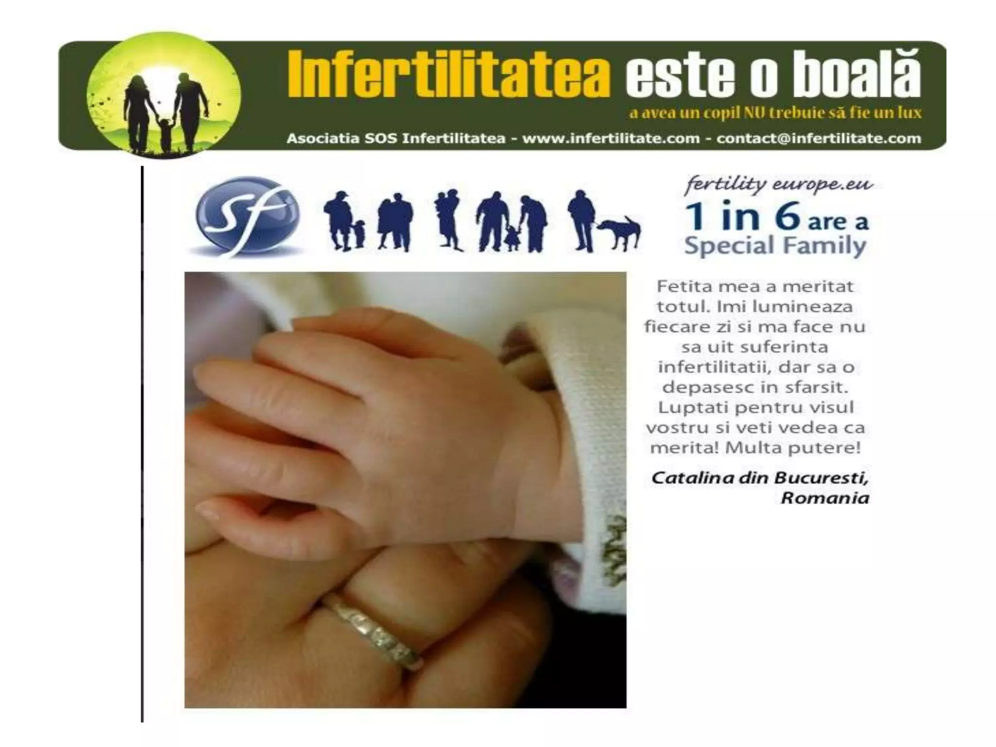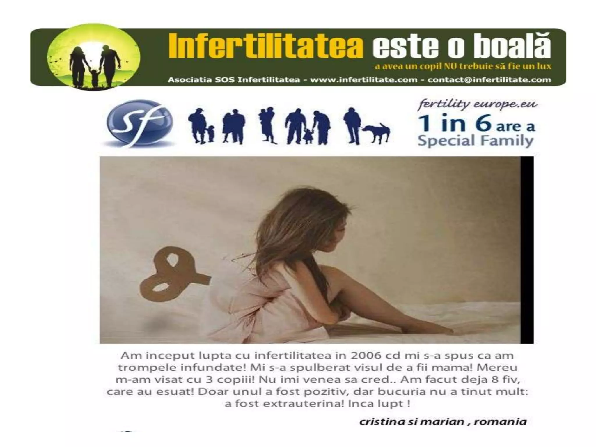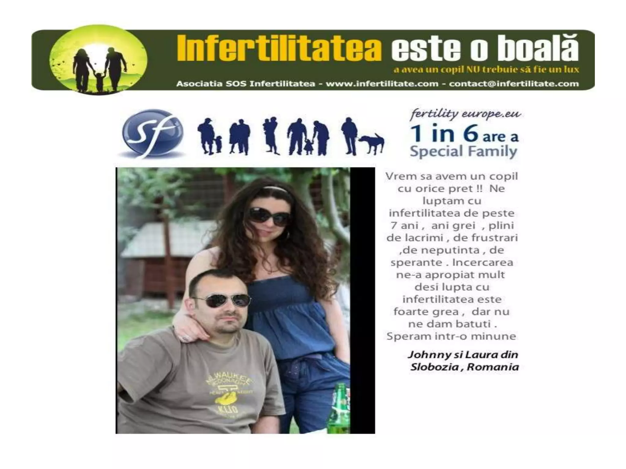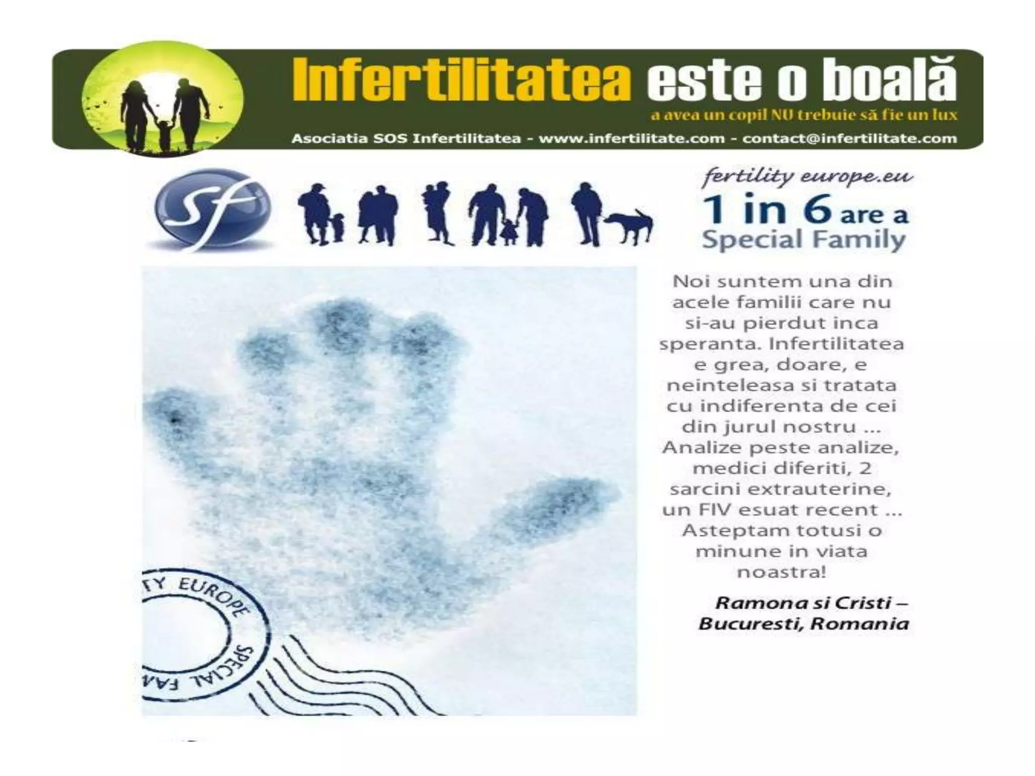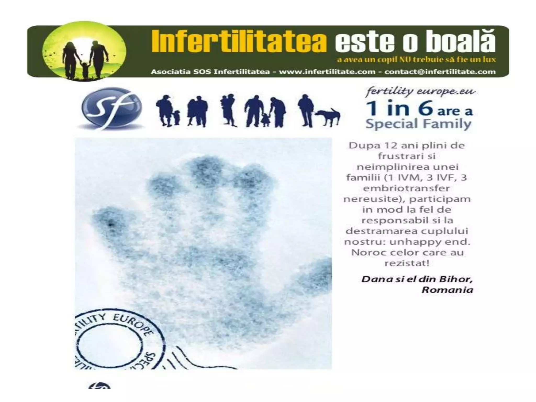 Unul din șase cupluri din Europa se confruntă cu probleme de fertilitate, afectând aproximativ 10 milioane de persoane care au nevoie de sprijin. Asociația SOS Infertilitate participă la o campanie paneuropeană subliniind impactul infertilității și desfășoară acțiuni de advocacy pentru conștientizarea acestei probleme. Organizația funcționează din donații și sponsorizări, fără angajați plătiți, și are ca obiectiv responsabilizarea clasei politice românești.