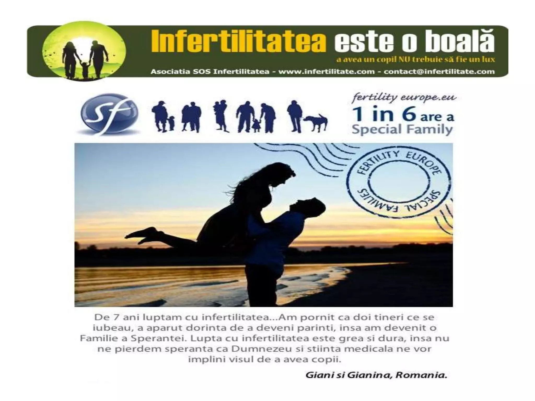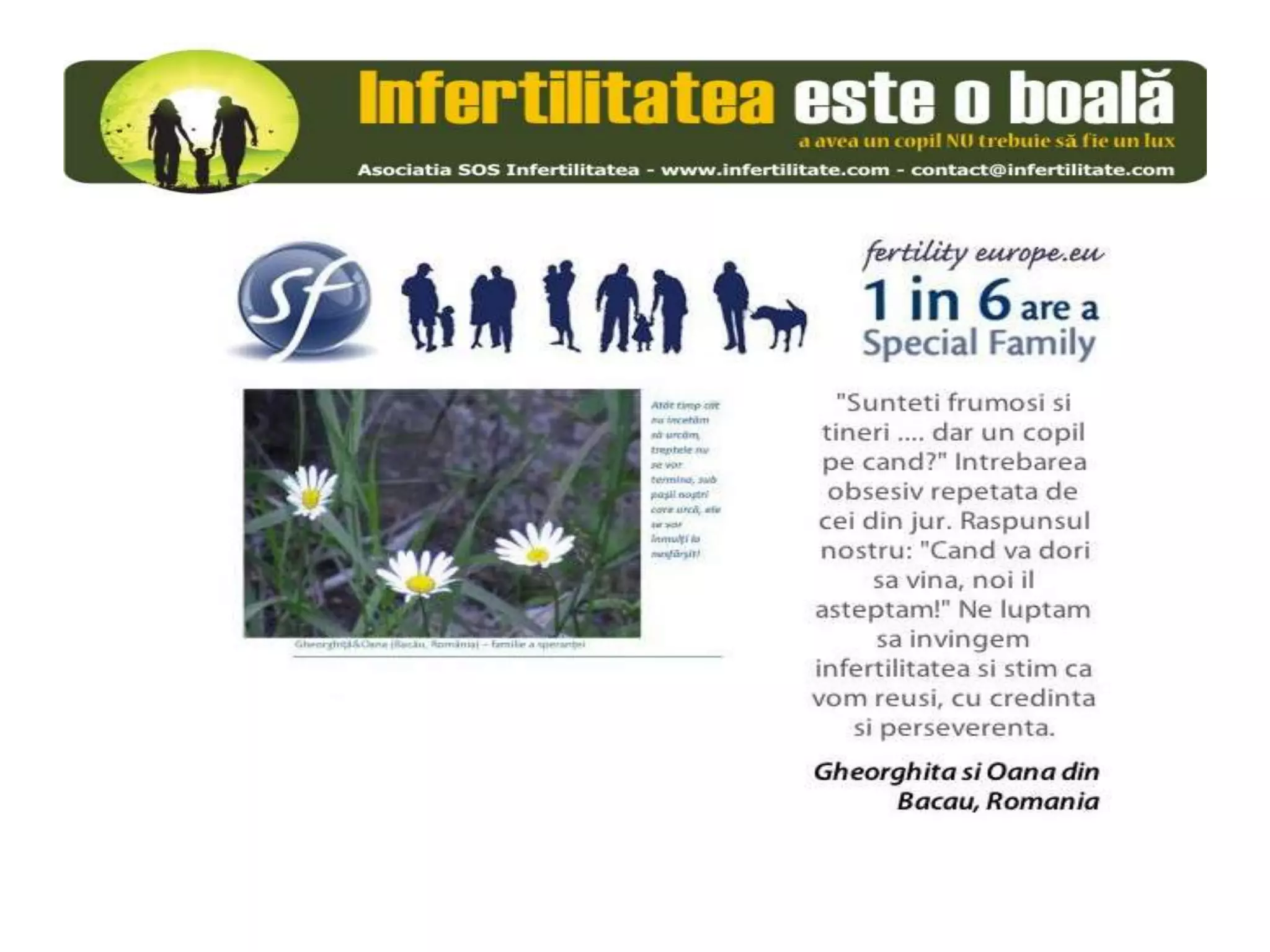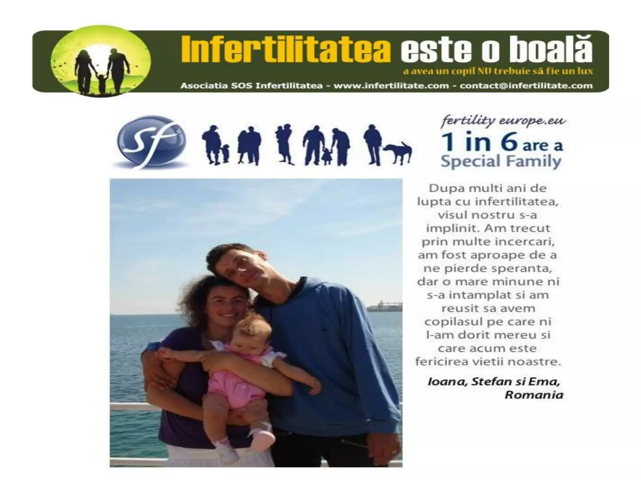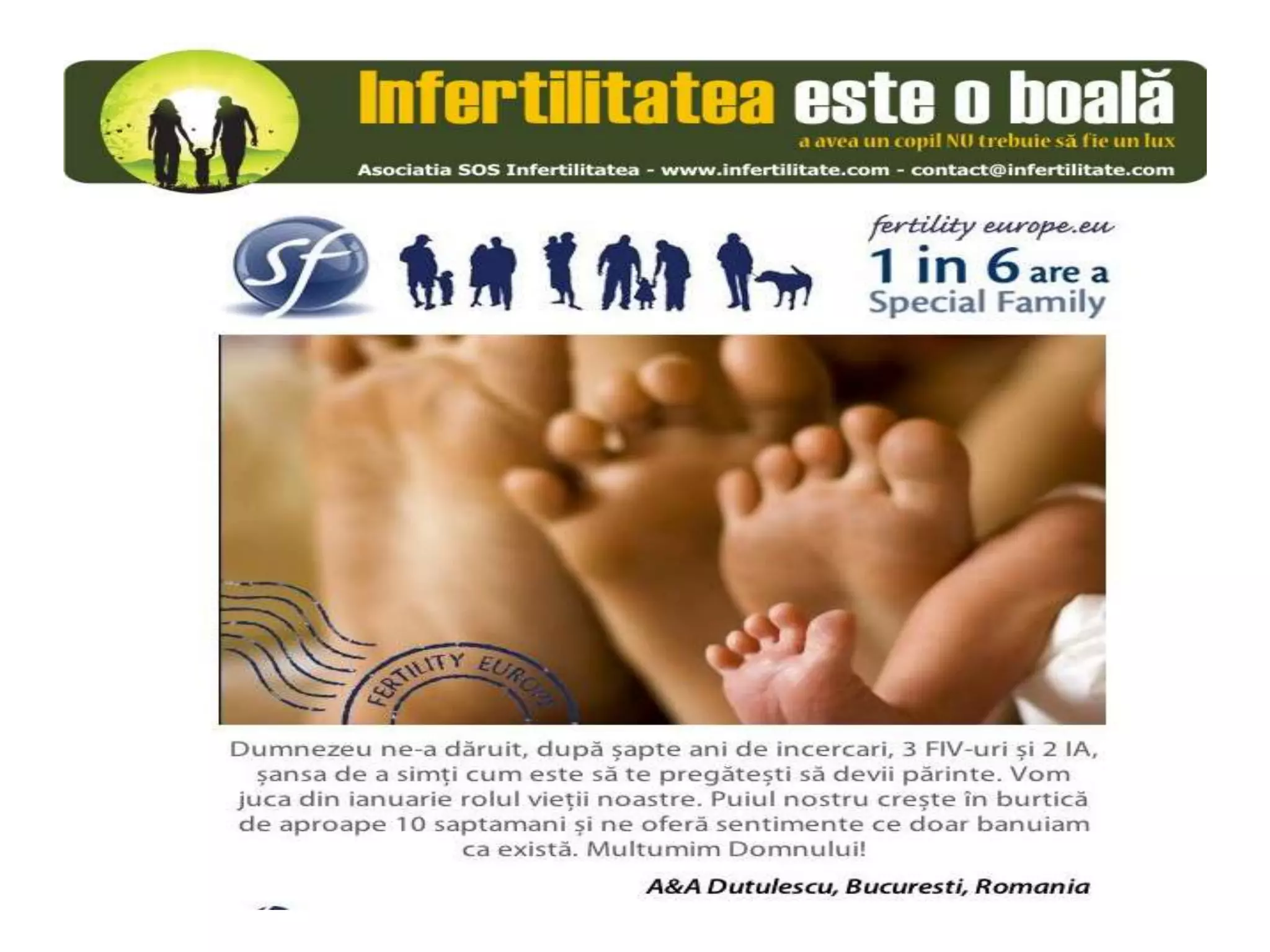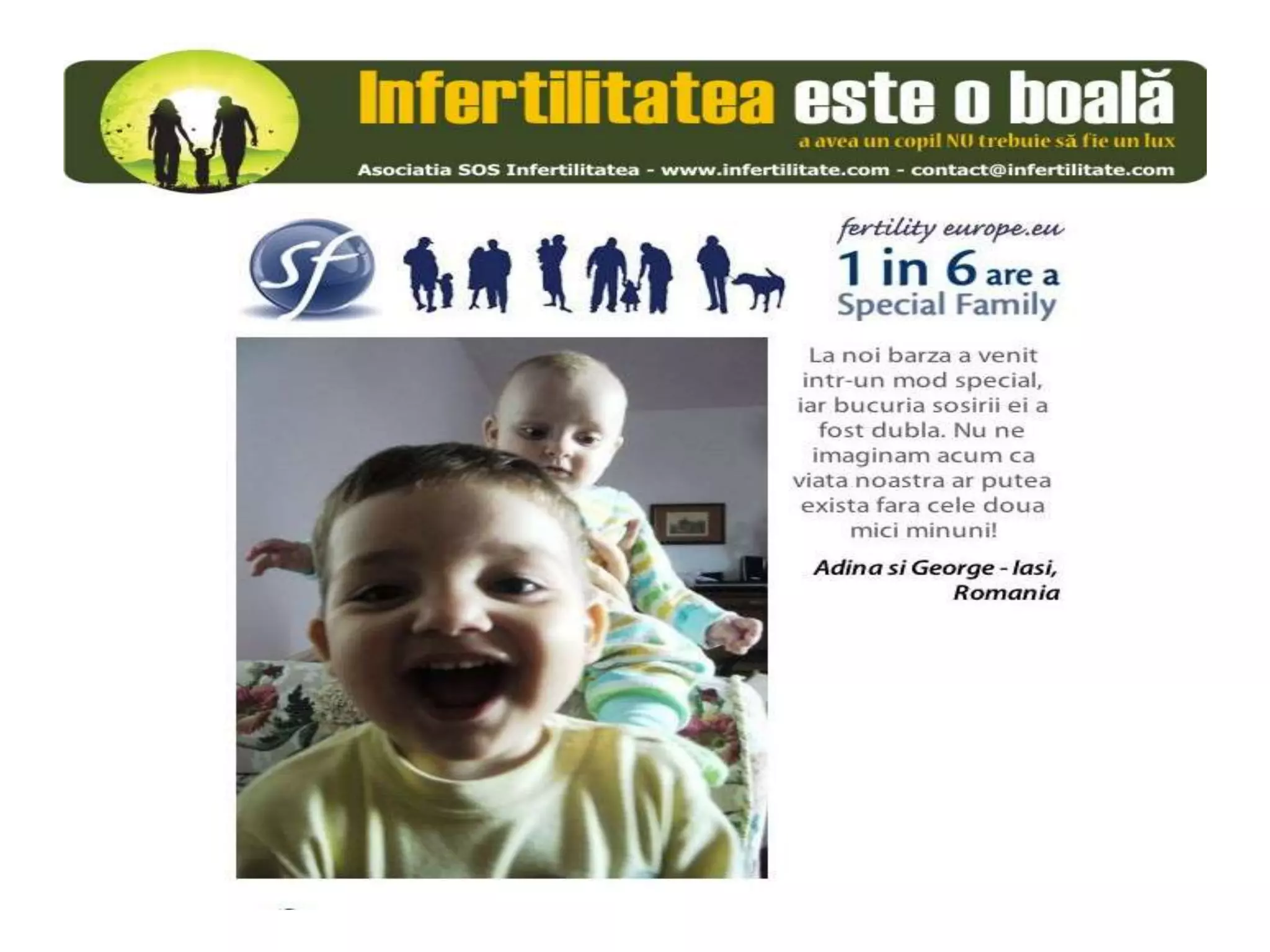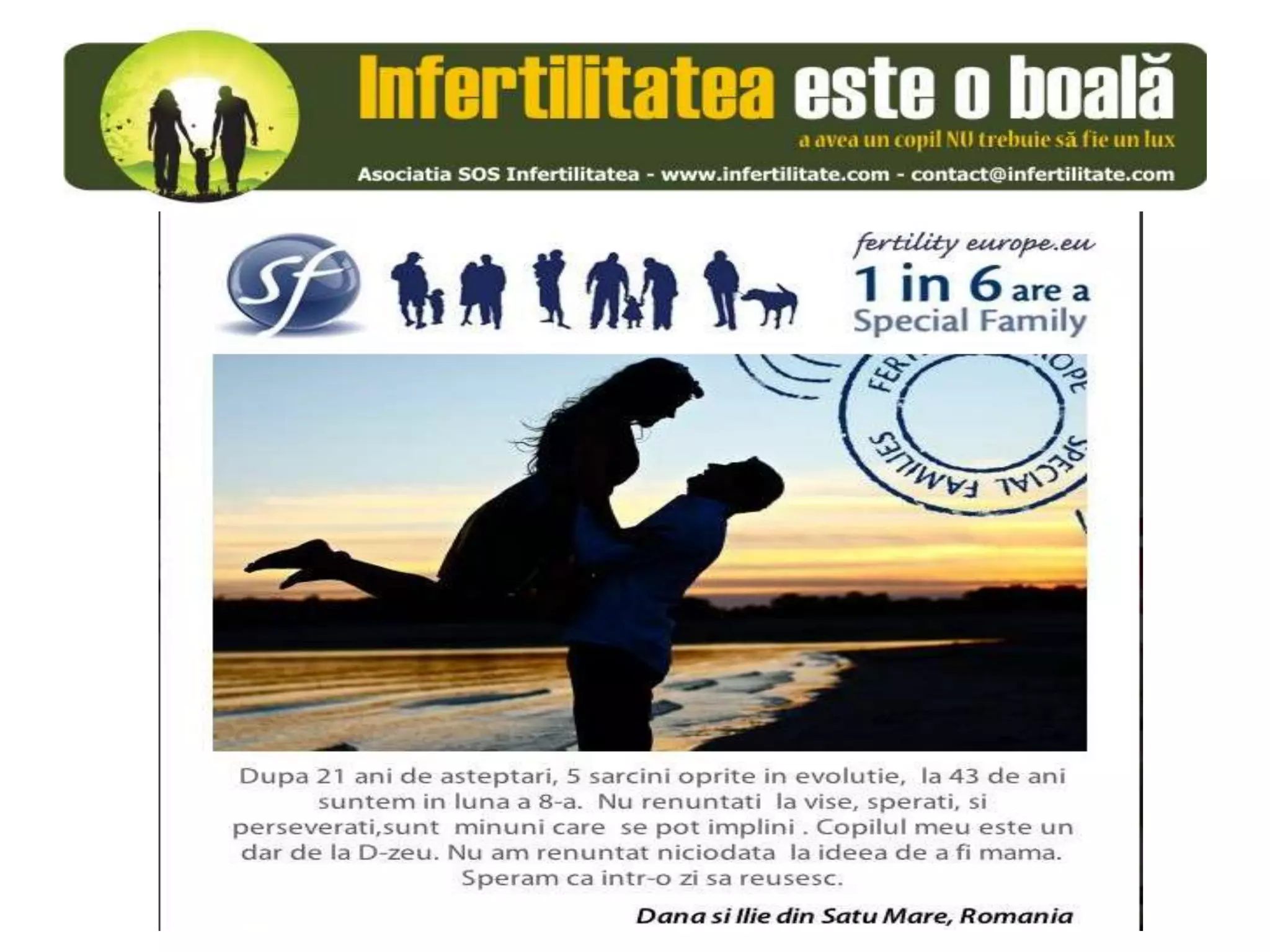 Unul din șase cupluri din Europa se confruntă cu probleme de fertilitate, afectând aproximativ 10 milioane de persoane care au nevoie de sprijin. Asociația SOS Infertilitate participă la o campanie paneuropeană subliniind impactul infertilității și desfășoară acțiuni de advocacy pentru conștientizarea acestei probleme. Organizația funcționează din donații și sponsorizări, fără angajați plătiți, și are ca obiectiv responsabilizarea clasei politice românești.