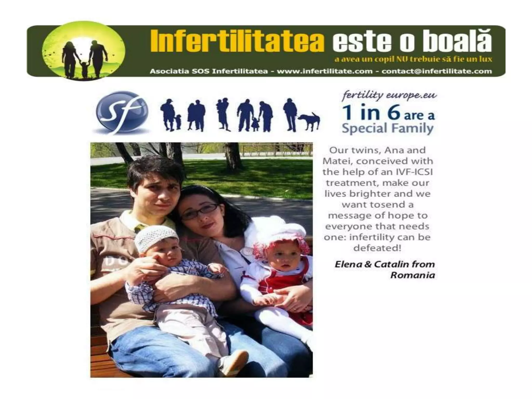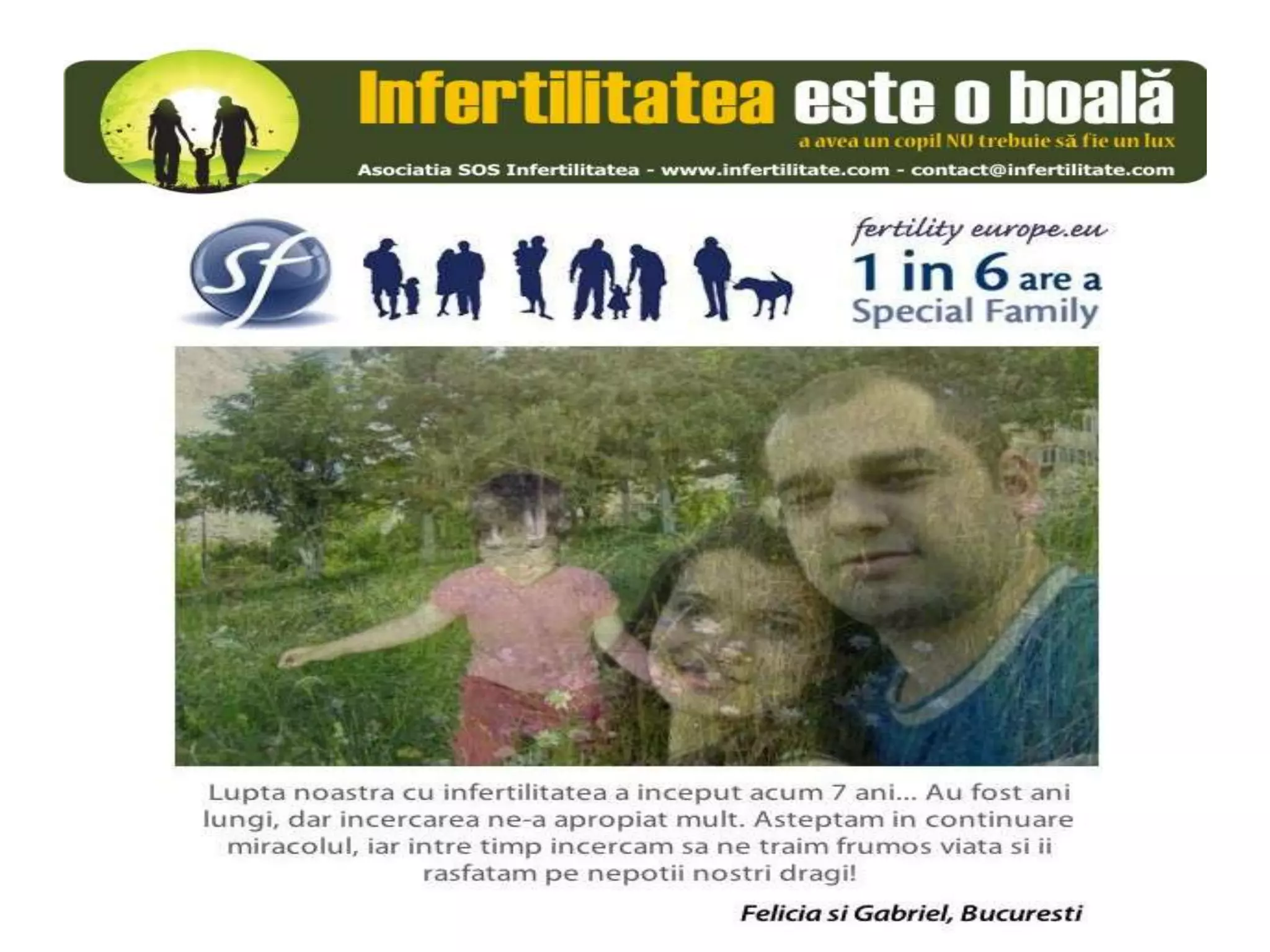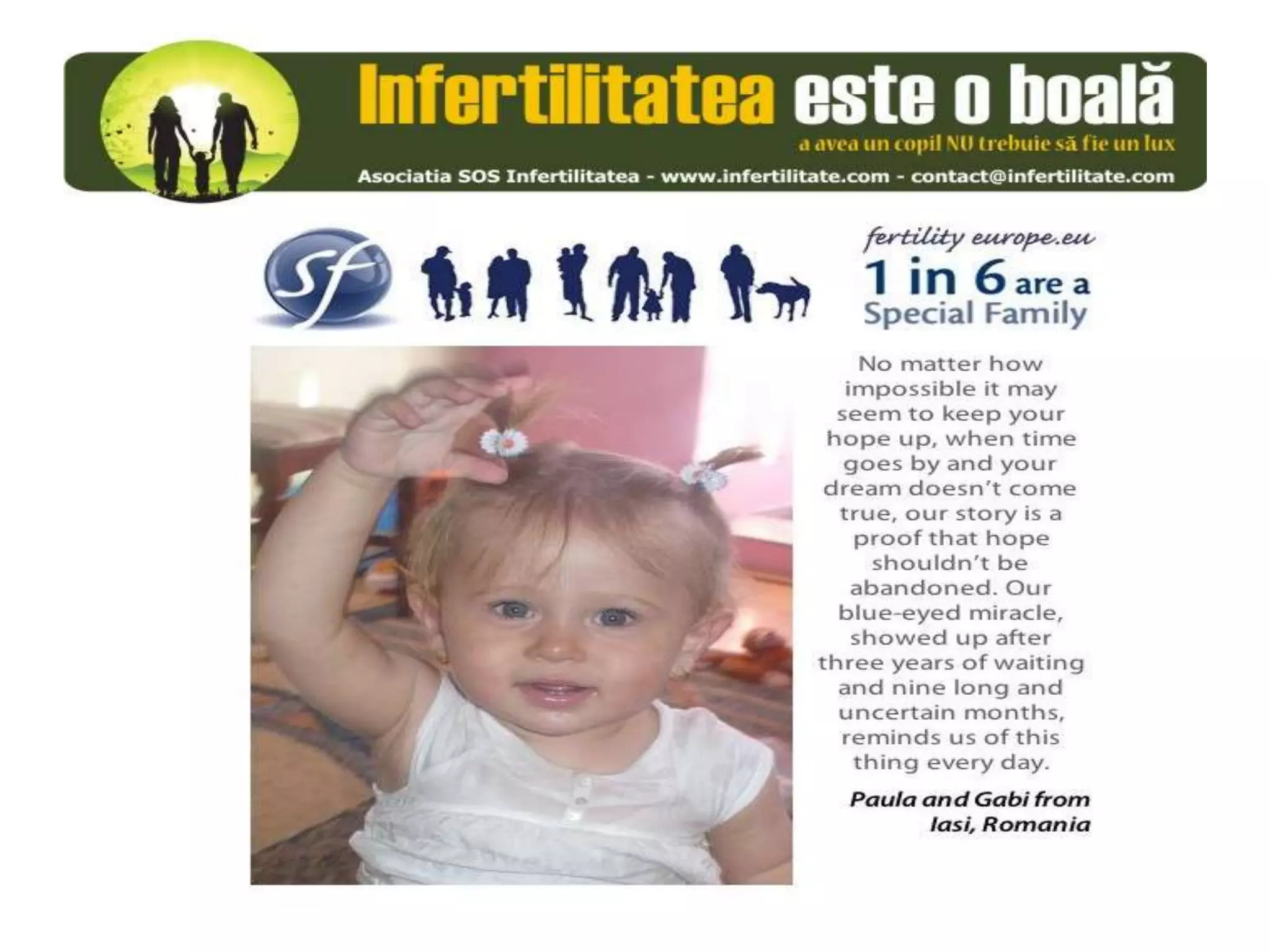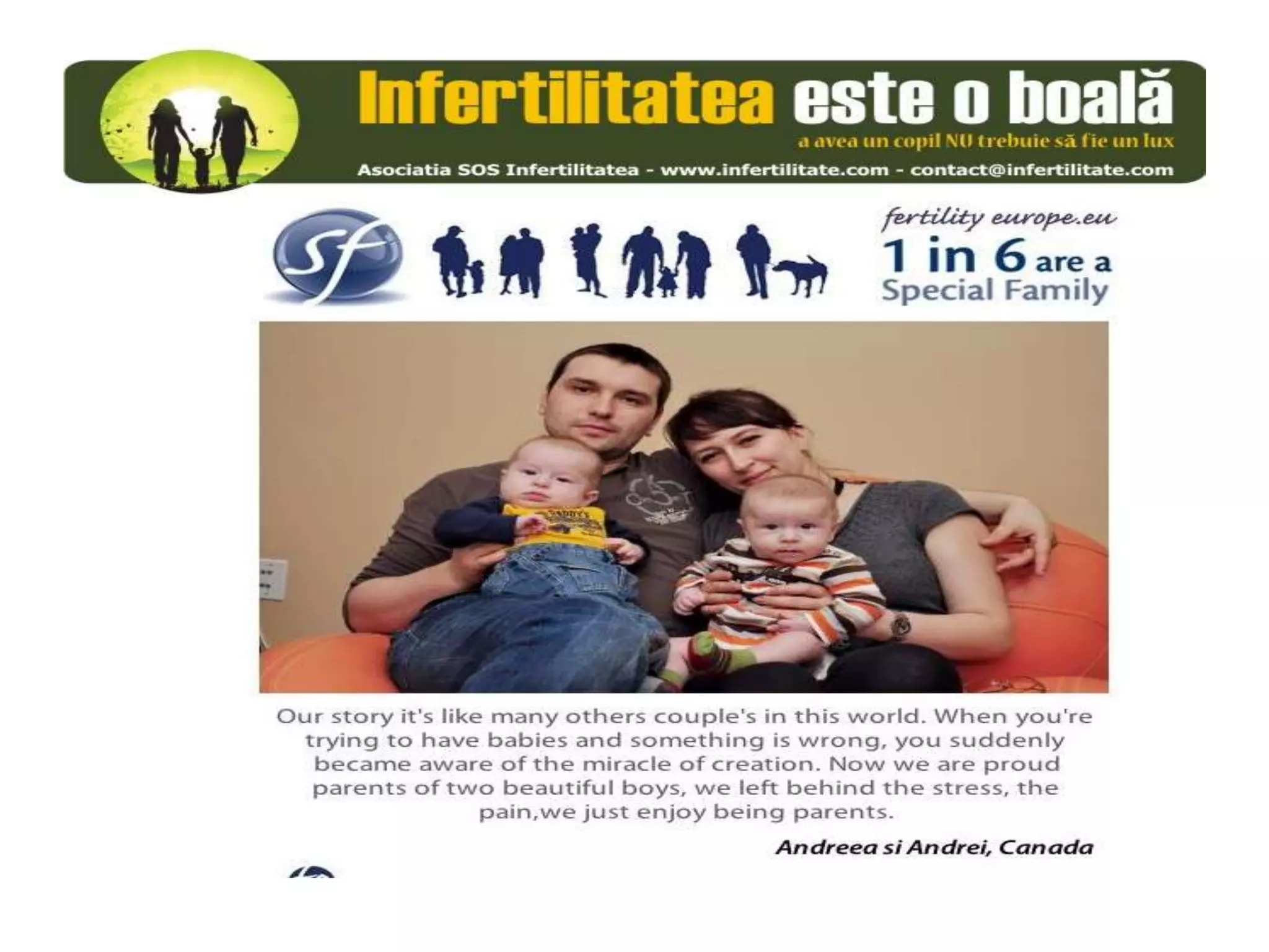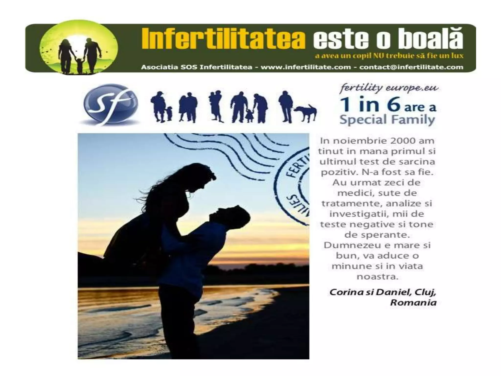 Unul din șase cupluri din Europa se confruntă cu probleme de fertilitate, afectând aproximativ 10 milioane de persoane care au nevoie de sprijin. Asociația SOS Infertilitate participă la o campanie paneuropeană subliniind impactul infertilității și desfășoară acțiuni de advocacy pentru conștientizarea acestei probleme. Organizația funcționează din donații și sponsorizări, fără angajați plătiți, și are ca obiectiv responsabilizarea clasei politice românești.