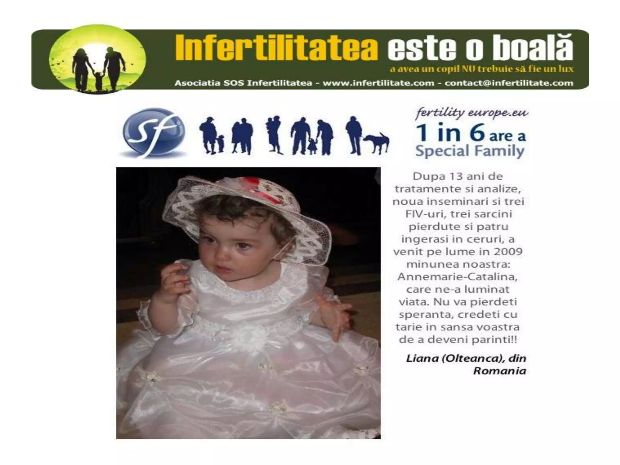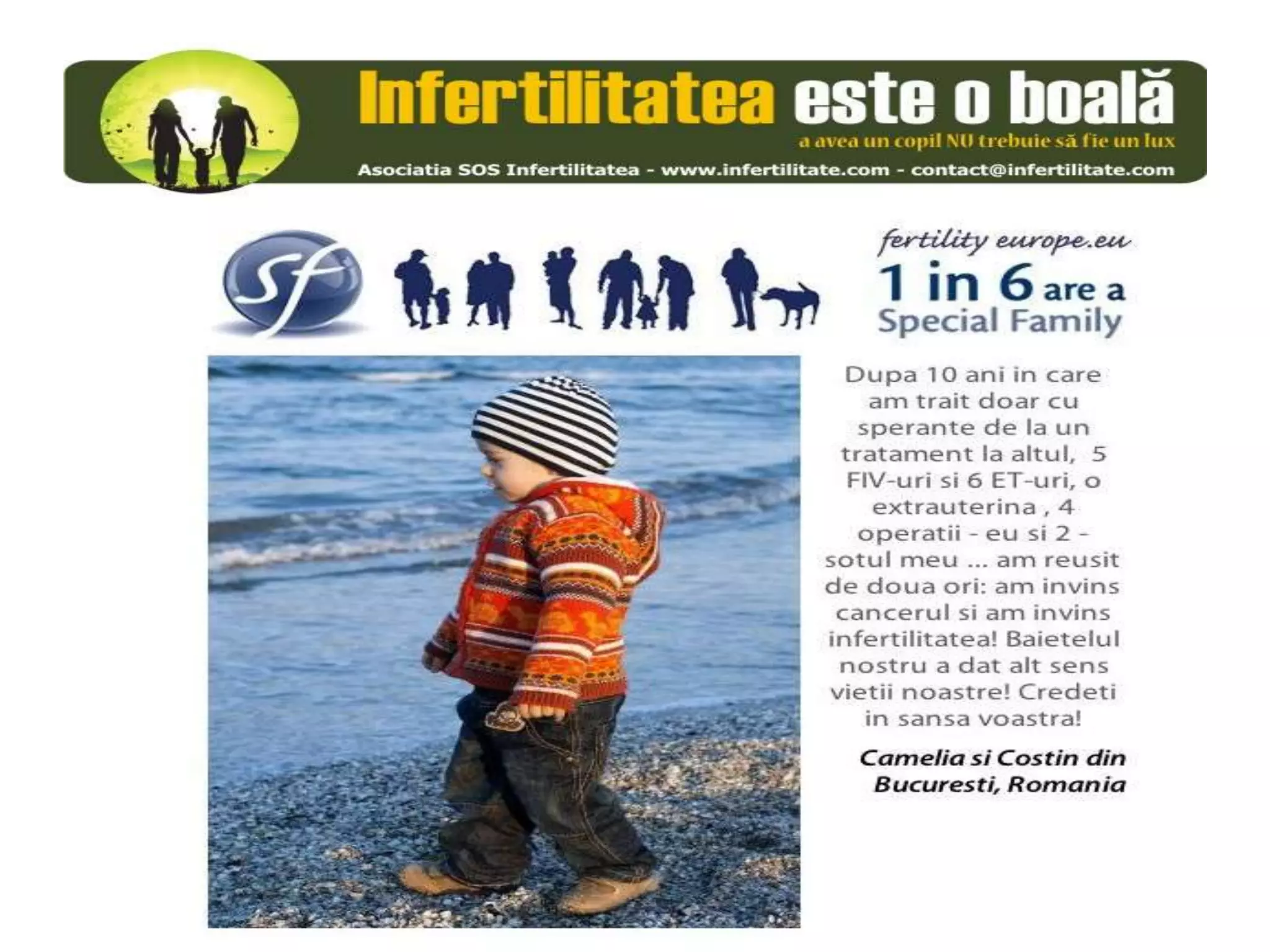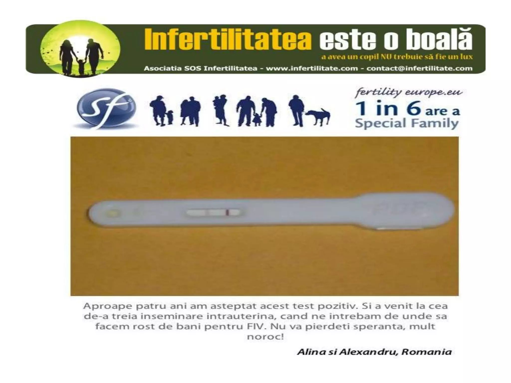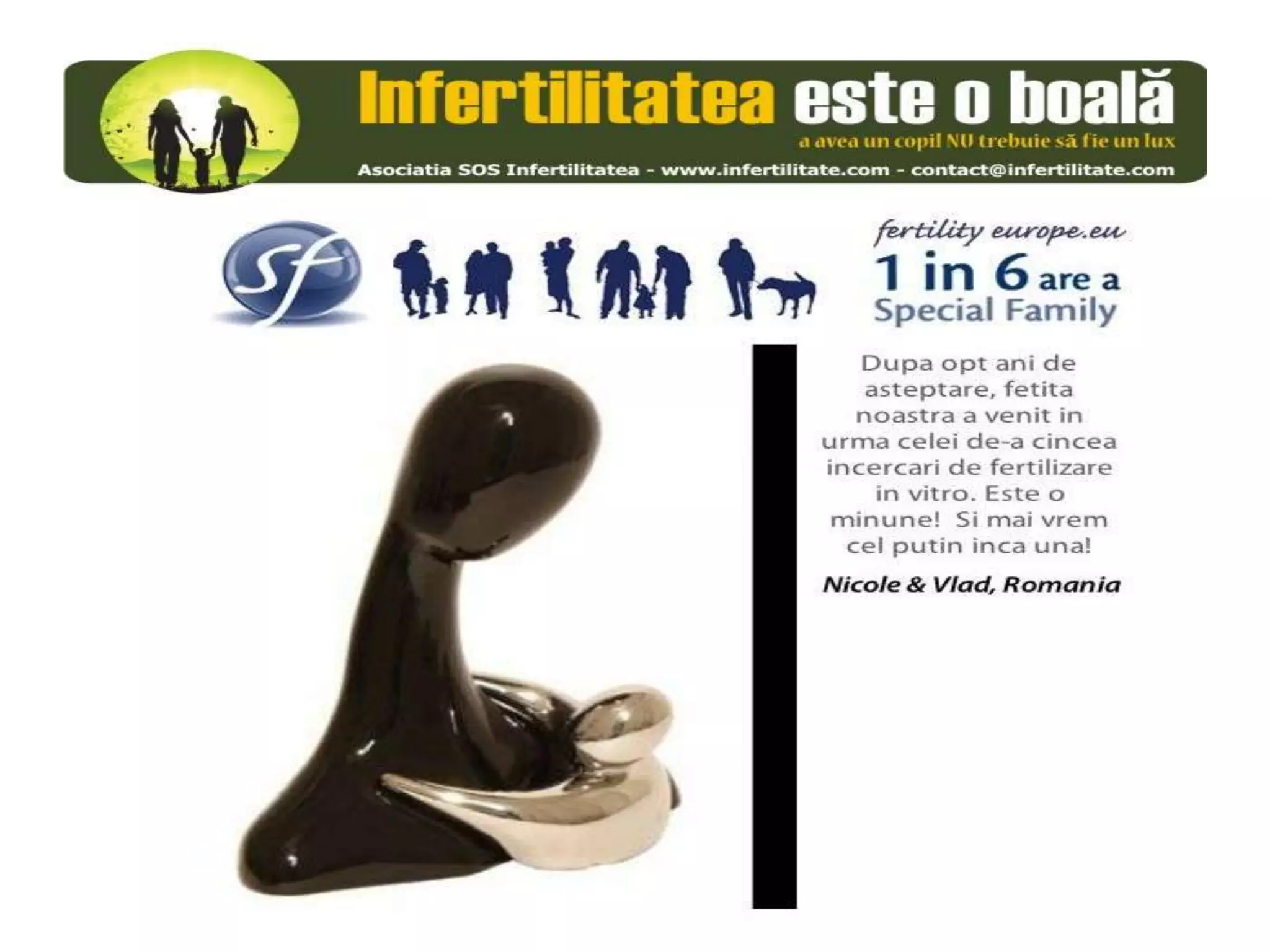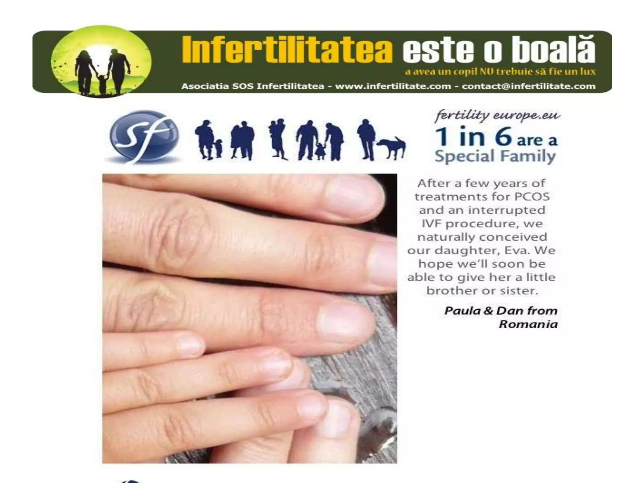 Unul din șase cupluri din Europa se confruntă cu probleme de fertilitate, afectând aproximativ 10 milioane de persoane care au nevoie de sprijin. Asociația SOS Infertilitate participă la o campanie paneuropeană subliniind impactul infertilității și desfășoară acțiuni de advocacy pentru conștientizarea acestei probleme. Organizația funcționează din donații și sponsorizări, fără angajați plătiți, și are ca obiectiv responsabilizarea clasei politice românești.