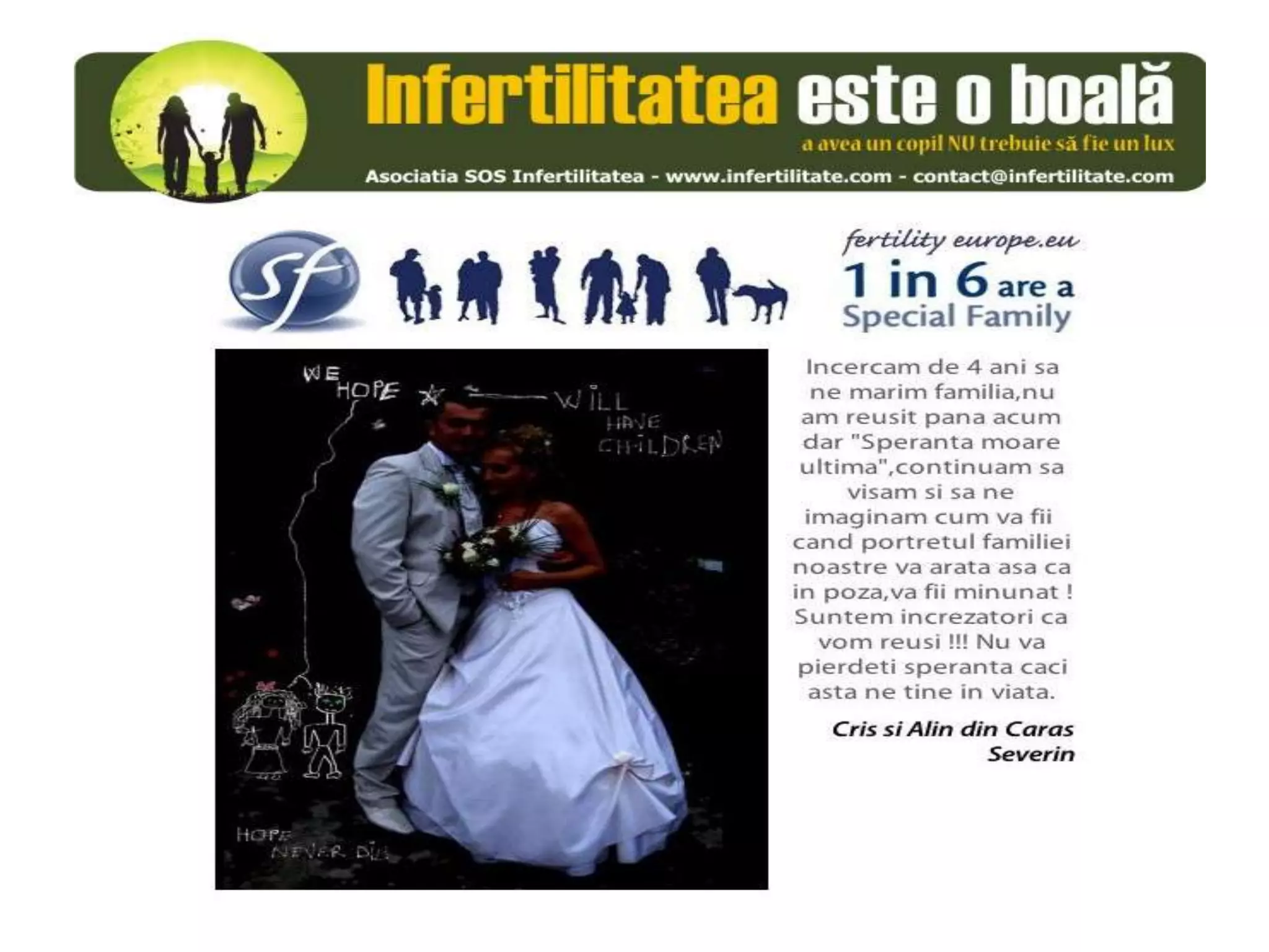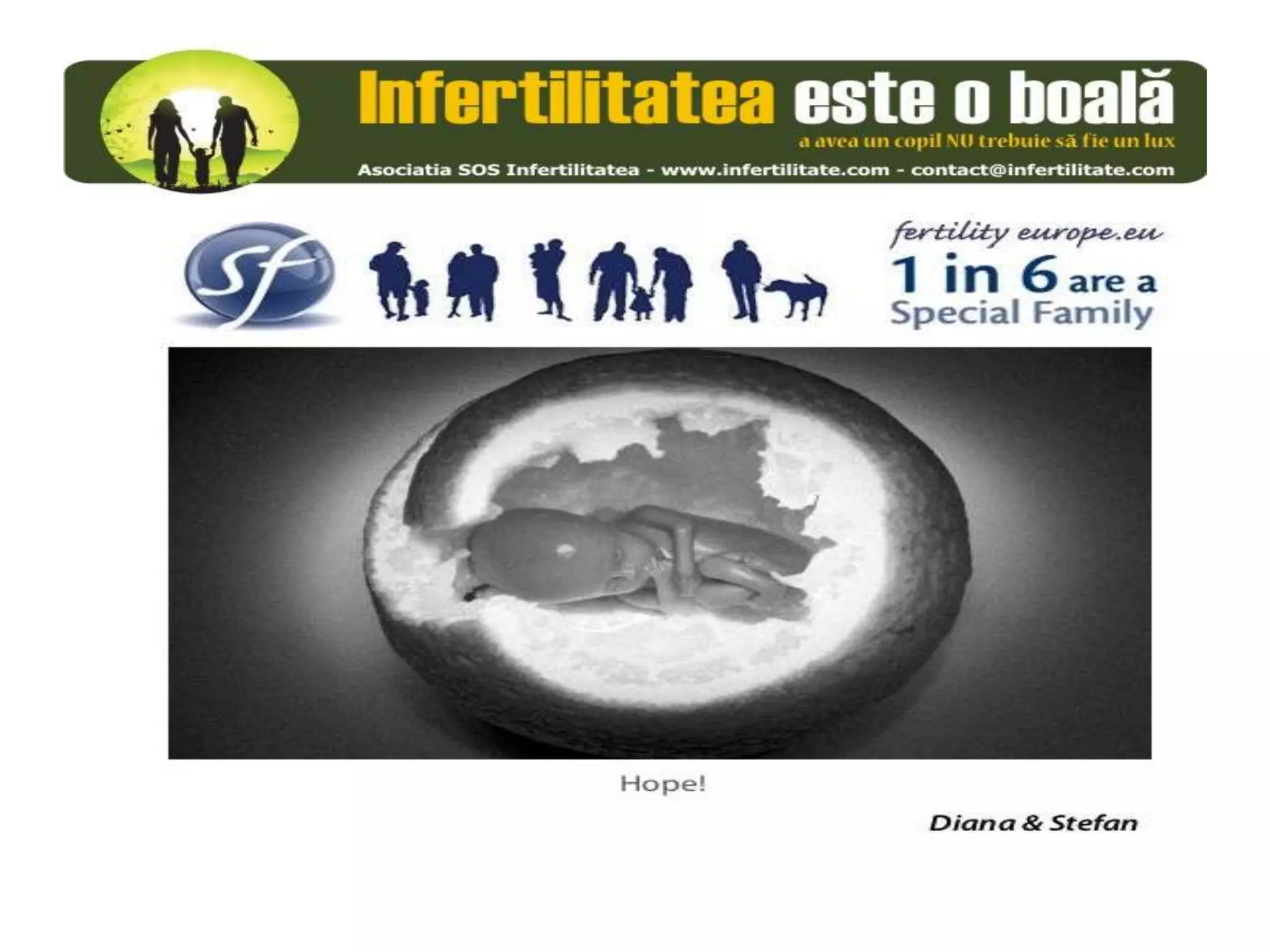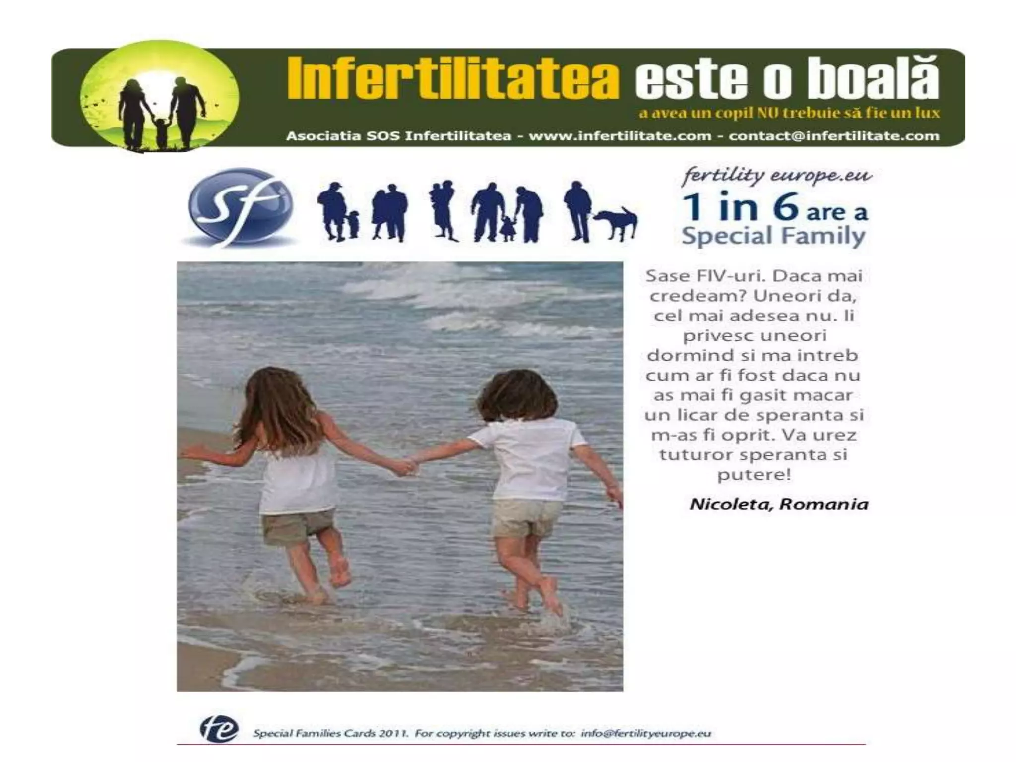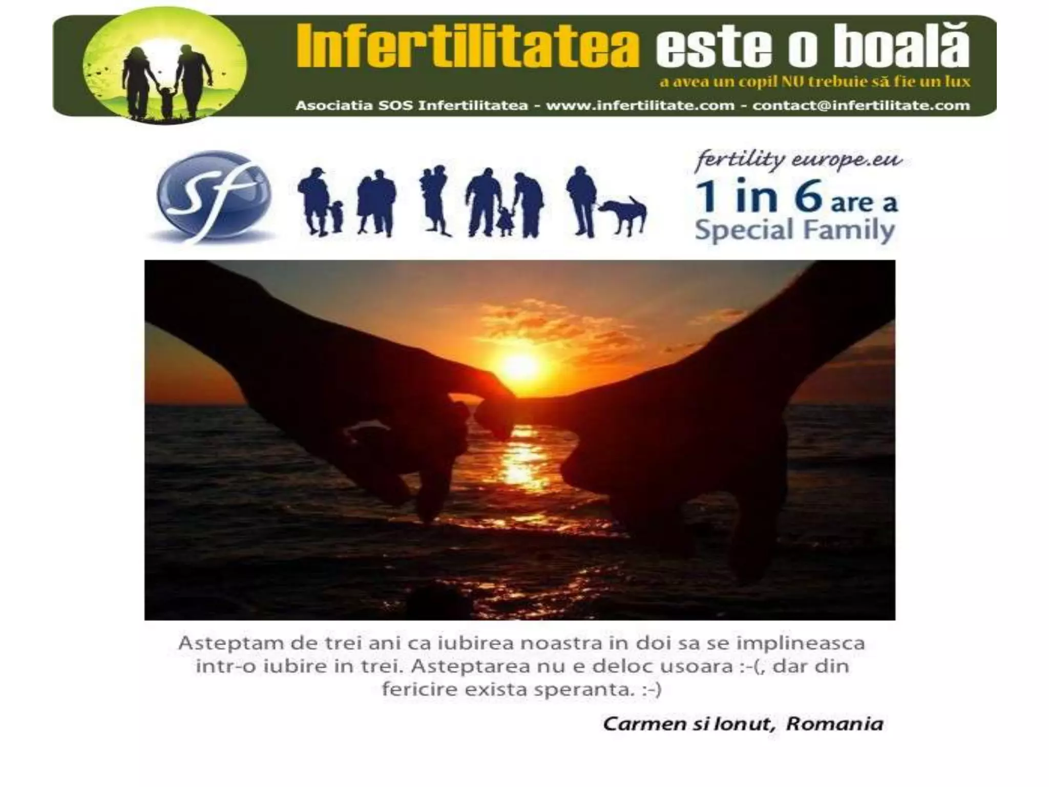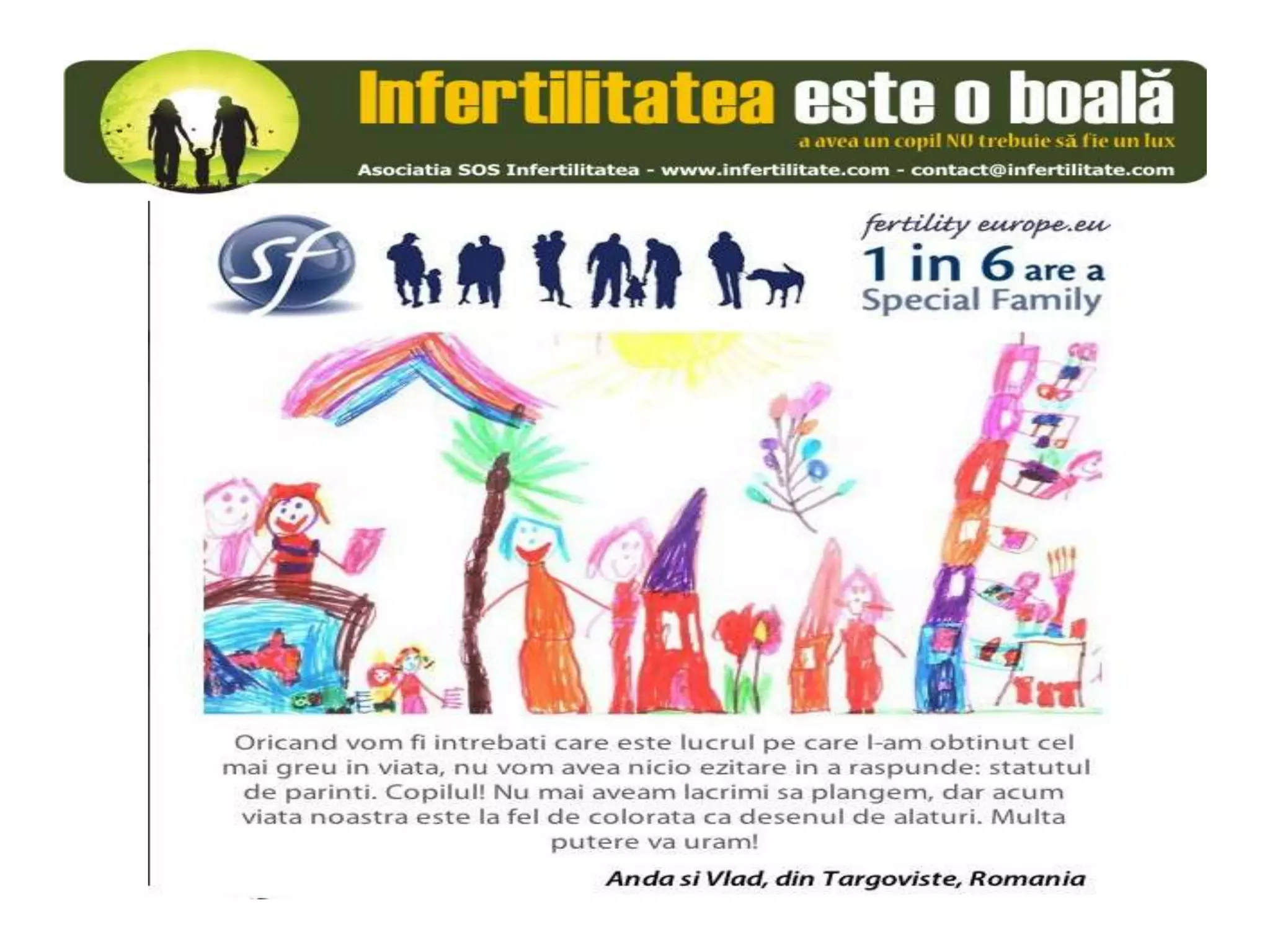 Unul din șase cupluri din Europa se confruntă cu probleme de fertilitate, afectând aproximativ 10 milioane de persoane care au nevoie de sprijin. Asociația SOS Infertilitate participă la o campanie paneuropeană subliniind impactul infertilității și desfășoară acțiuni de advocacy pentru conștientizarea acestei probleme. Organizația funcționează din donații și sponsorizări, fără angajați plătiți, și are ca obiectiv responsabilizarea clasei politice românești.