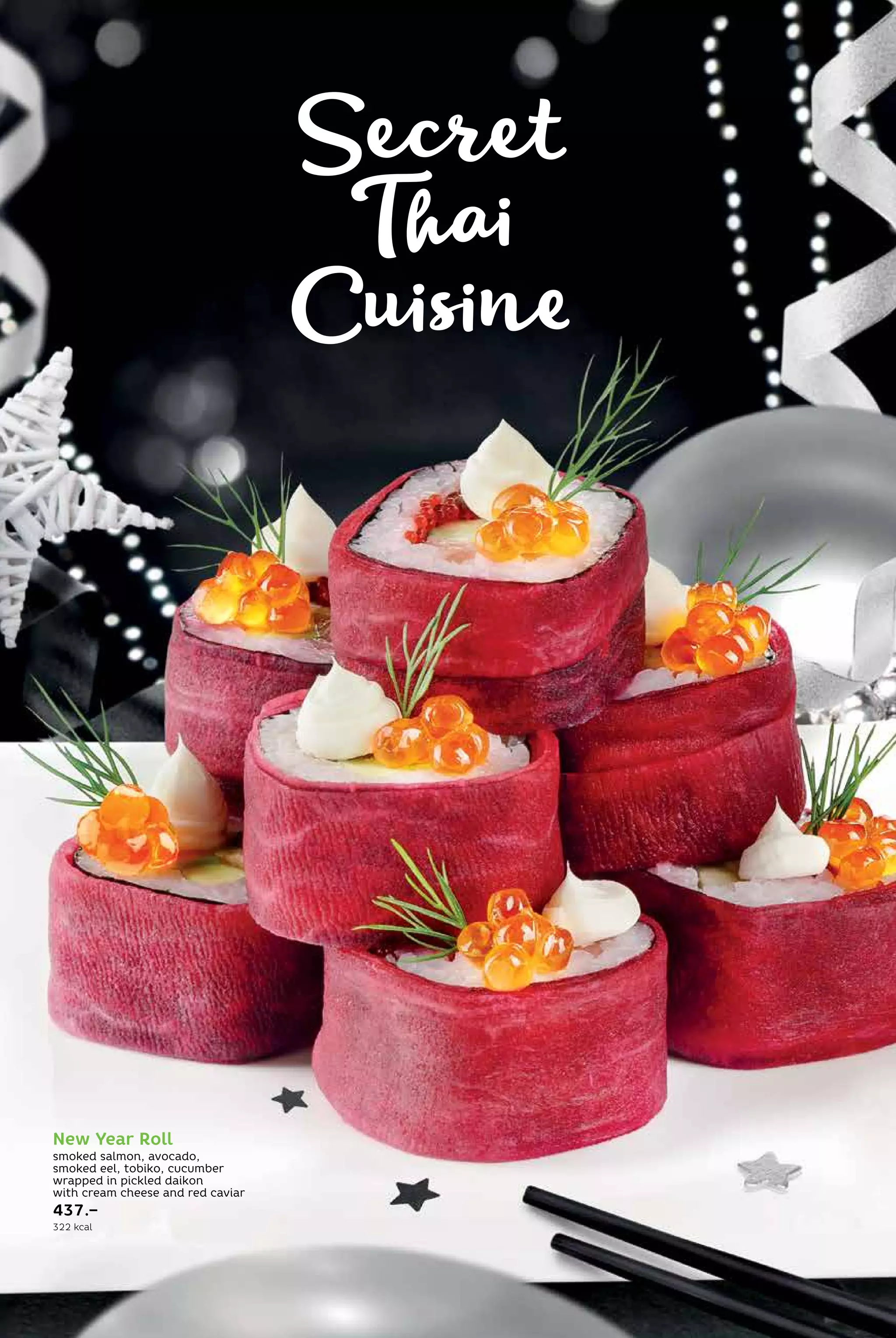 This document describes several sushi and salad options as well as soup and entree selections from a Thai restaurant menu. The sushi options include rolls with ingredients like smoked salmon, avocado, eel, and caviar. Salads feature ingredients such as pomelo, tiger prawns, duck, and lychee. Listed soups include tom yum soup made with salmon, spicy beef soup, and tom kha gai. Entrees are also described like Xinjiang-style lamb, chicken satay, and Shanghai-style zander. All menu items include nutritional information for calories.
