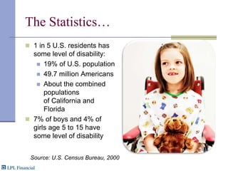 The document outlines the fundamentals of special needs planning, emphasizing the importance of addressing the care and financial security of individuals with disabilities. It provides statistics highlighting the prevalence of disabilities in the U.S. and details a step-by-step planning process that includes creating care plans, legal arrangements, and financial strategies. The document also explains various types of special needs trusts that can protect government benefits while providing for disabled individuals.