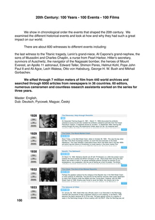 This document describes a documentary series called "100 Years - 100 Films" that chronicles major historical events of the 20th century through eyewitness interviews and archival footage. It examines 100 pivotal events from 1900 to 1999, sourcing over 7 million meters of film and interviews with 600 witnesses. A large international team of editors, researchers, and film crews spent three years curating the 100 films to tell the story of the century through those who lived it.