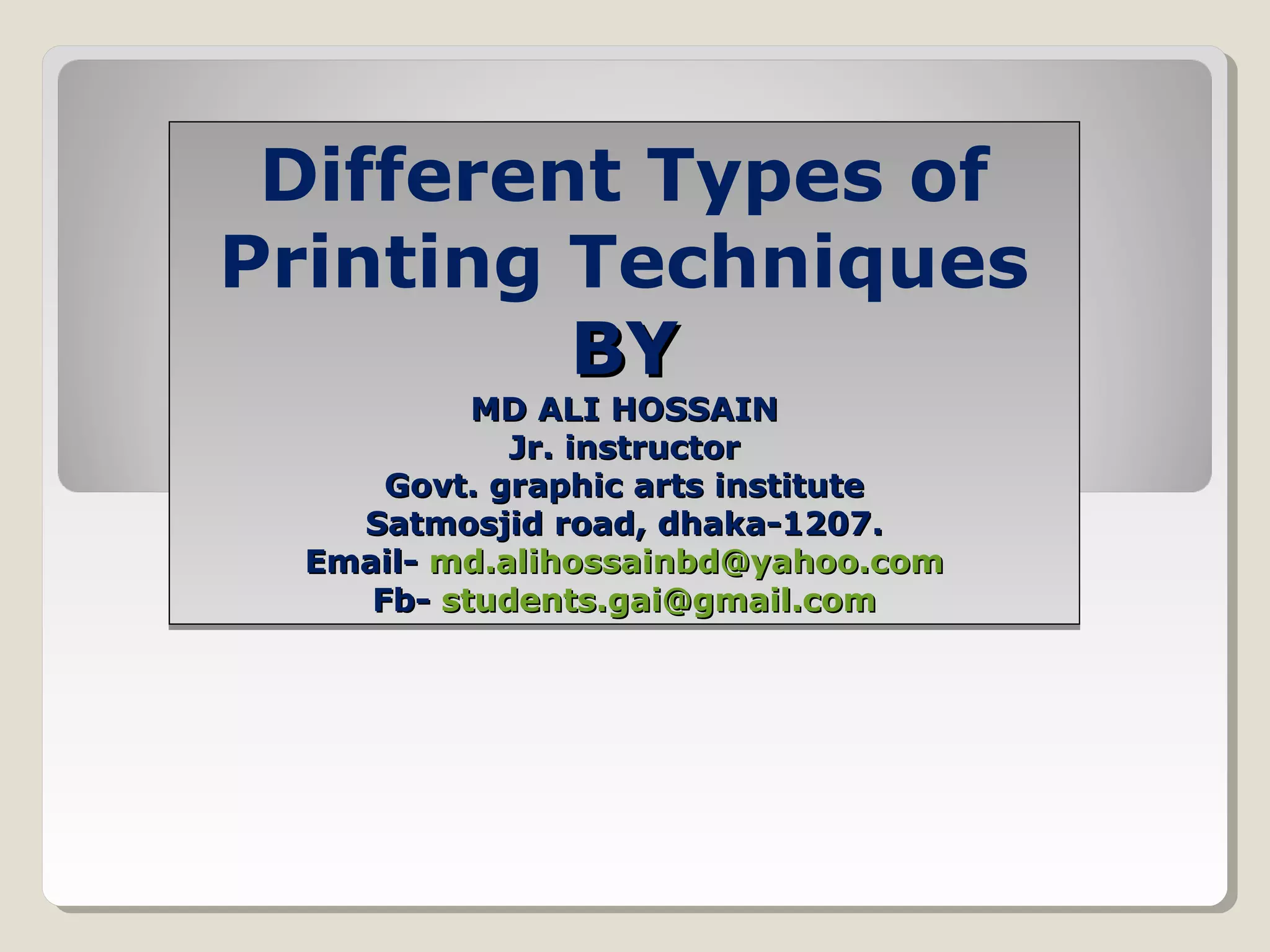 The document discusses different printing techniques, including screen printing, which is used for t-shirts and billboards. Digital printing uses inkjet or laser printing without plates. Engraving creates raised surfaces on paper using a metal die. Flexography uses flexible plates to print on packaging materials like bags and cups. Gravure and letterpress are older techniques, while offset lithography uses plates to transfer images to paper. Reprographics involves duplicating images electronically or mechanically. Thermography applies powder to adhere ink in stationery printing.