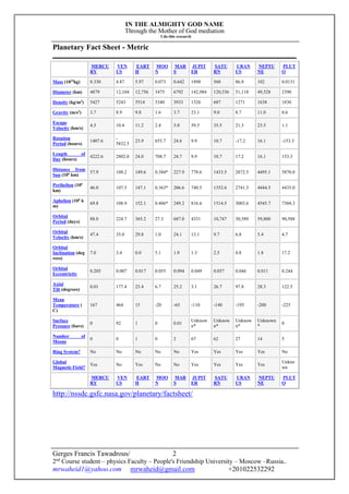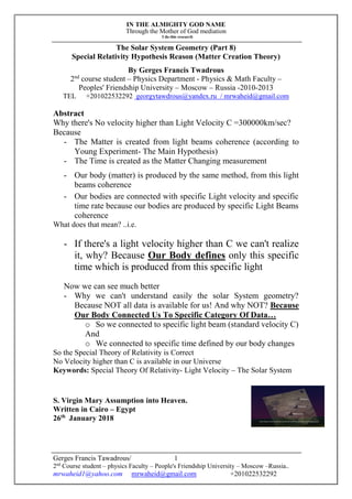 The document presents a research paper by Gerges Francis Tawadrous that explores a new theory on matter creation based on the principles of special relativity and light. It suggests that matter, including human bodies, is formed from coherent light beams and posits that all physical velocities are limited to the speed of light. Additionally, it includes a planetary fact sheet detailing various attributes of solar system planets and discusses the geometric relationships among them.