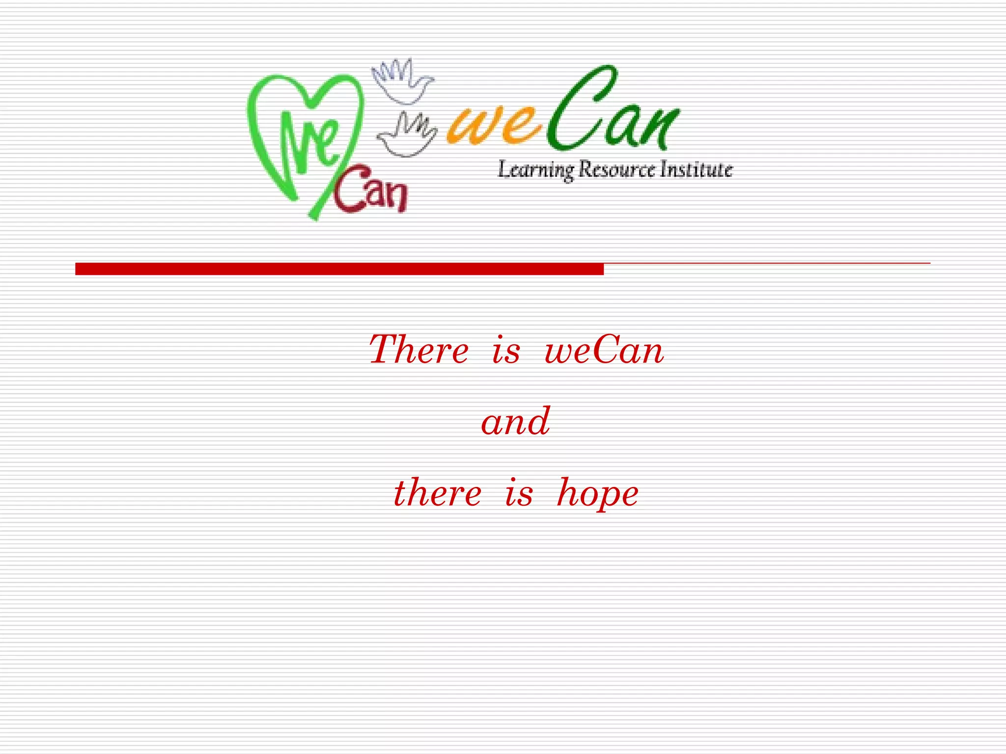 The document summarizes the services provided by weCan, an organization that supports children with special needs. [1] weCan provides specialized learning programs and interventions to help children with conditions like ADHD, dyslexia, autism and learning disabilities improve their academic performance and social skills. [2] Their goal is to bridge the gap between a child's actual and expected performance through individualized attention. [3] They promote inclusive education and creating welcoming classrooms for children of all abilities.