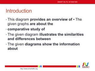 The document provides guidance on vocabulary and phrases for summarizing graphs and diagrams. It includes examples of introducing topics, emphasizing key features, describing trends, comparing numbers and percentages, estimating future patterns, specifying time periods, noting surprising changes, and showing overall associations or impressions. Phrases are given for discussing graphs in an academic IELTS writing task.