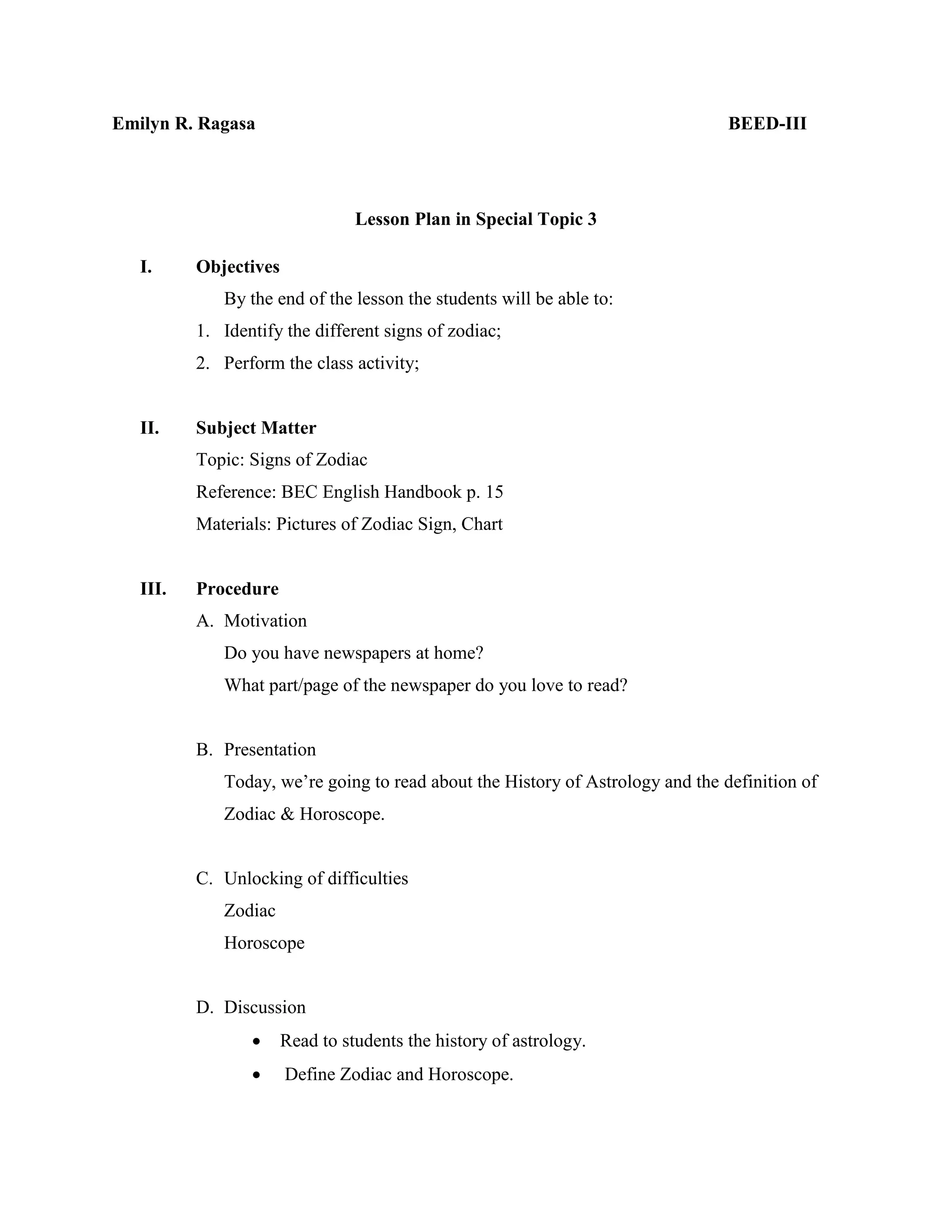 The lesson plan aims to teach students about the signs of the zodiac. It includes objectives, subject matter on signs of the zodiac from a reference book, and procedures for motivation, presentation, discussion, and evaluation. The procedures involve reading the history of astrology, defining key terms, and an activity to correctly copy signs of the zodiac into the proper element columns. Students are also asked to look for animals in ads and discuss what products they represent and why those animals were chosen.