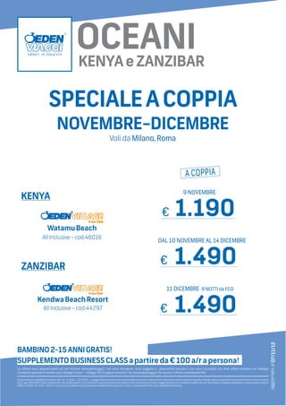 Sono disponibili pacchetti speciali per coppie a novembre-dicembre per voli da Milano e Roma verso Kenya e Zanzibar, con offerte all inclusive a partire da € 1.190. Bambini tra i 2 e i 15 anni viaggiano gratis, e un supplemento per la business class è disponibile a partire da € 100 a/r. Le offerte sono teleprenotabili sul sito di Eden Viaggi e sono soggette a disponibilità limitata.