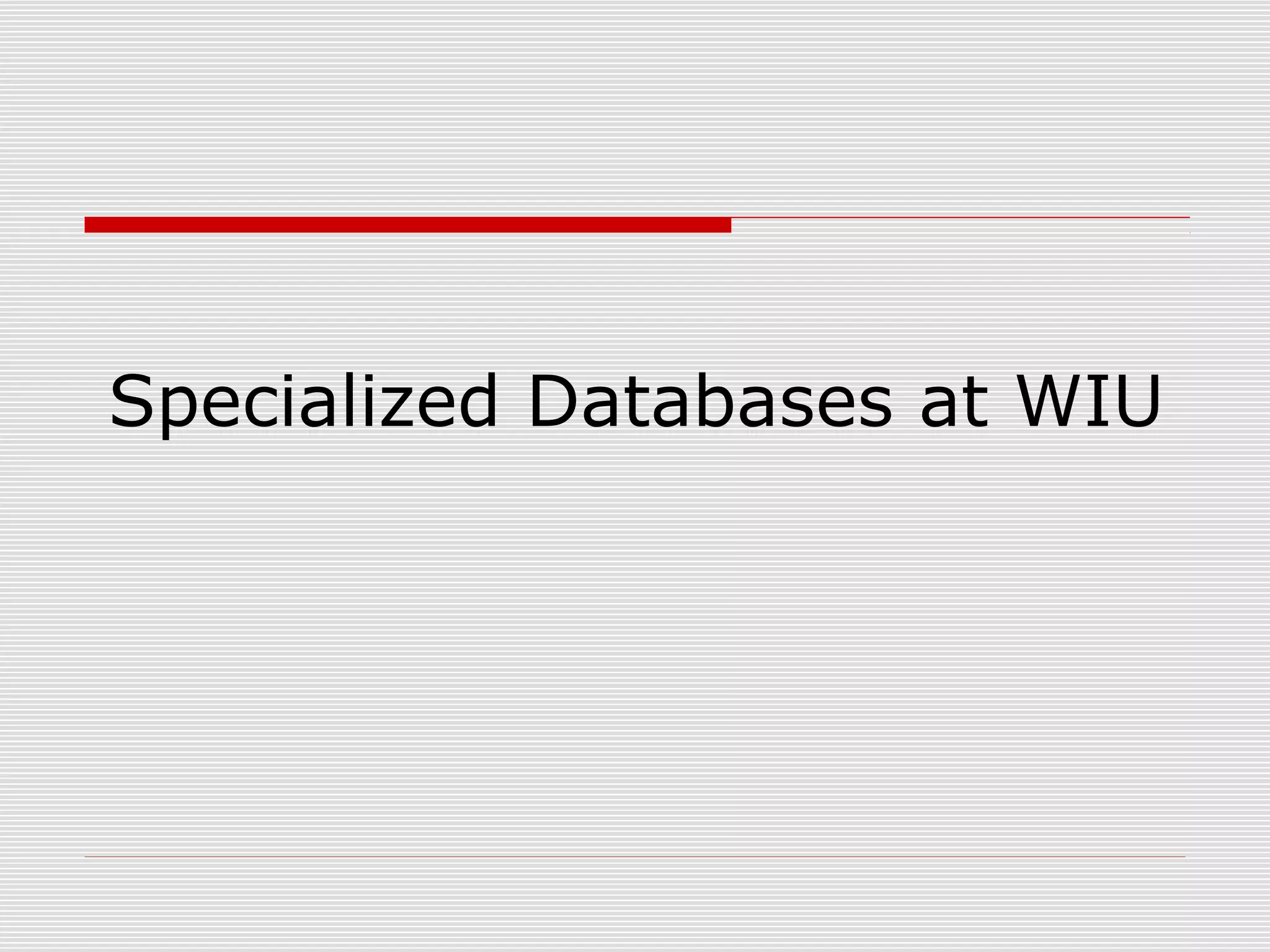 The document provides summaries of specialized databases available at WIU, including America: History and Life, Historical Abstracts, Opposing Viewpoints Resource Center, ABI/Inform, JSTOR, Academic Search Complete, NCJRS Abstracts Database, SportDiscus, PsycINFO, Access World News, MEDLINE/PubMed, Sociological Abstracts, GPO Monthly Catalog, International Bibliography of Theatre & Dance, and CQ Researcher. Each database covers literature, journals, reports and other materials on specific subject areas such as history, business, social issues, criminal justice, sports, psychology, medicine, sociology, government publications, performing arts, and current events.