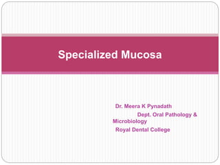 This document summarizes the specialized mucosa and papillae found on the dorsal surface of the tongue. It describes the four main types of papillae - filliform, fungiform, circumvallate, and foliate papillae. It details their locations, histological features, and functions. The document also discusses taste buds and their role in gustation. Finally, it covers the clinical significance of some variations in tongue morphology and the differences seen in other species.