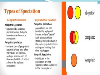 3. Parapatric speciation occurs when a smaller population is isolated at the periphery of a larger group and becomes differentiated to the point of becoming a new species, with possible continued gene flow.