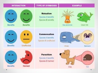 This document discusses different types of species interactions: neutralism, competition, amensalism, symbiotic relationships (commensalism, mutualism, parasitism), and antagonism (predation, herbivory). Neutralism occurs when two species do not affect each other. Competition involves two species requiring the same limited resources. Amensalism harms one species without benefiting the other. Symbiotic relationships benefit at least one organism. Antagonism benefits one species at the expense of another, such as through predation or herbivory.