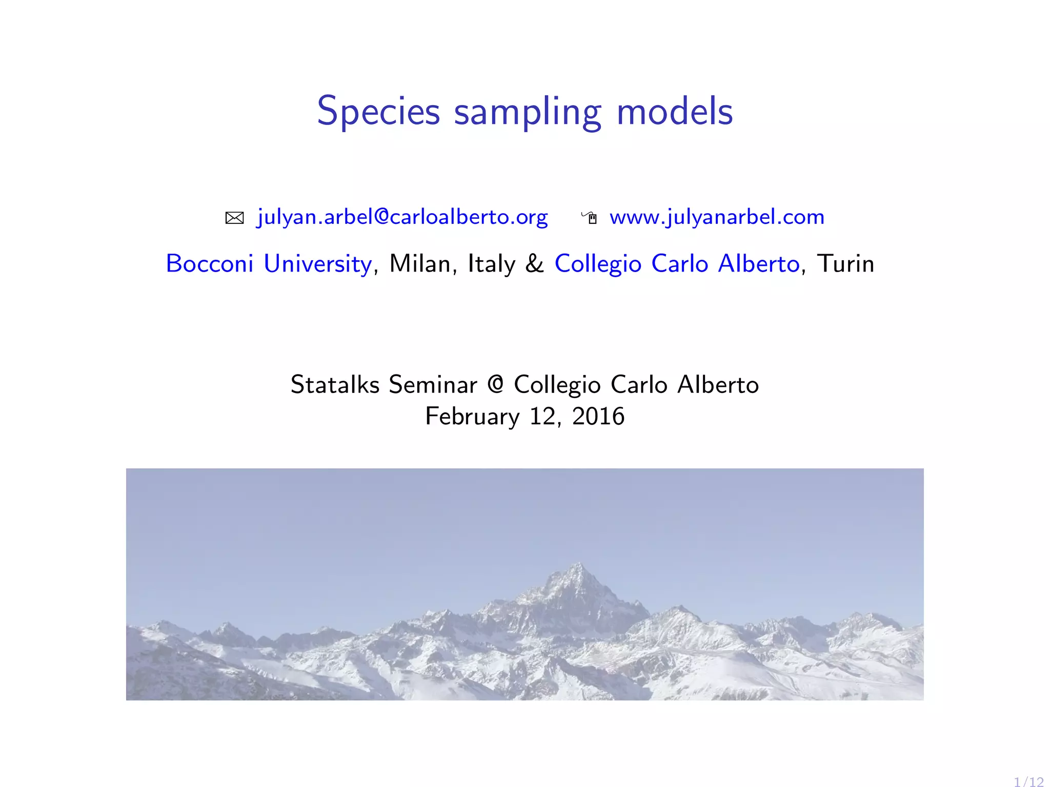 This document discusses species sampling models and discovery probabilities. It introduces the problem of estimating the probability of observing a new species given a sample. Good and Turing proposed an estimator for this during World War II. Bayesian nonparametric models provide an alternative approach by placing a prior on unknown species proportions. The document outlines BNP estimators for discovery probabilities and how credible intervals can be derived. It applies these methods to genomic datasets of expressed sequence tags to estimate discovery probabilities for observing new genes.