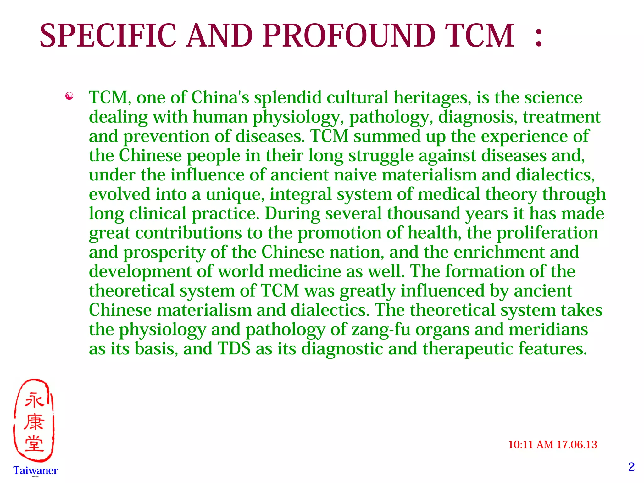 TCM is a traditional Chinese medical system that developed over thousands of years based on ancient Chinese philosophy. It views the human body as an interconnected whole and emphasizes keeping yin and yang in balance. TCM diagnoses illnesses by differentiating syndromes based on observing the patient's pulses, symptoms, medical history and other factors. Treatment is tailored to each patient's specific syndrome and condition.