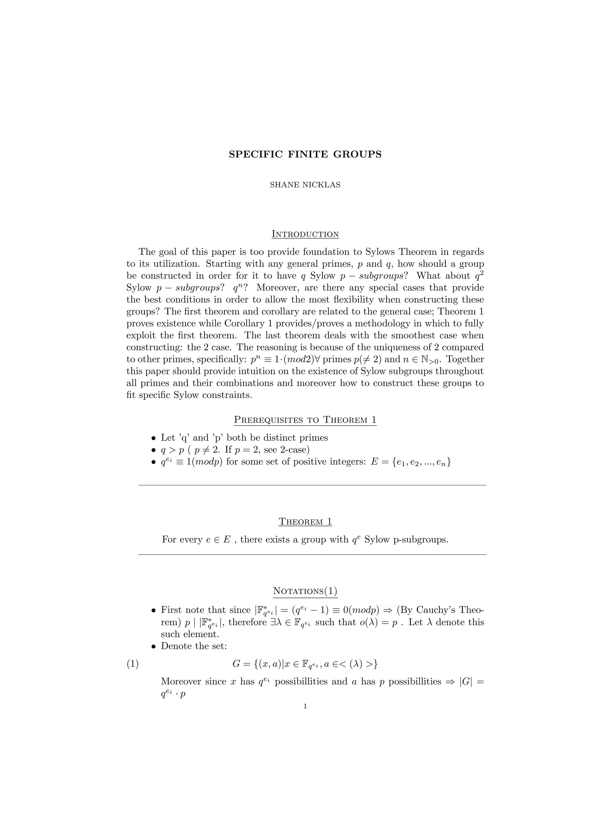 Theorem 1 proves the existence of a group with qe Sylow p-subgroups for any e in a set E. Corollary 1 extends this to allow constructing groups with qem Sylow p-subgroups for any m. Theorem 2 addresses the special case of 2-subgroups, showing there exists a group with n Sylow 2-subgroups for any odd positive integer n. The document establishes notation and provides proofs of lemmas supporting each theorem. It aims to provide intuition on constructing groups to