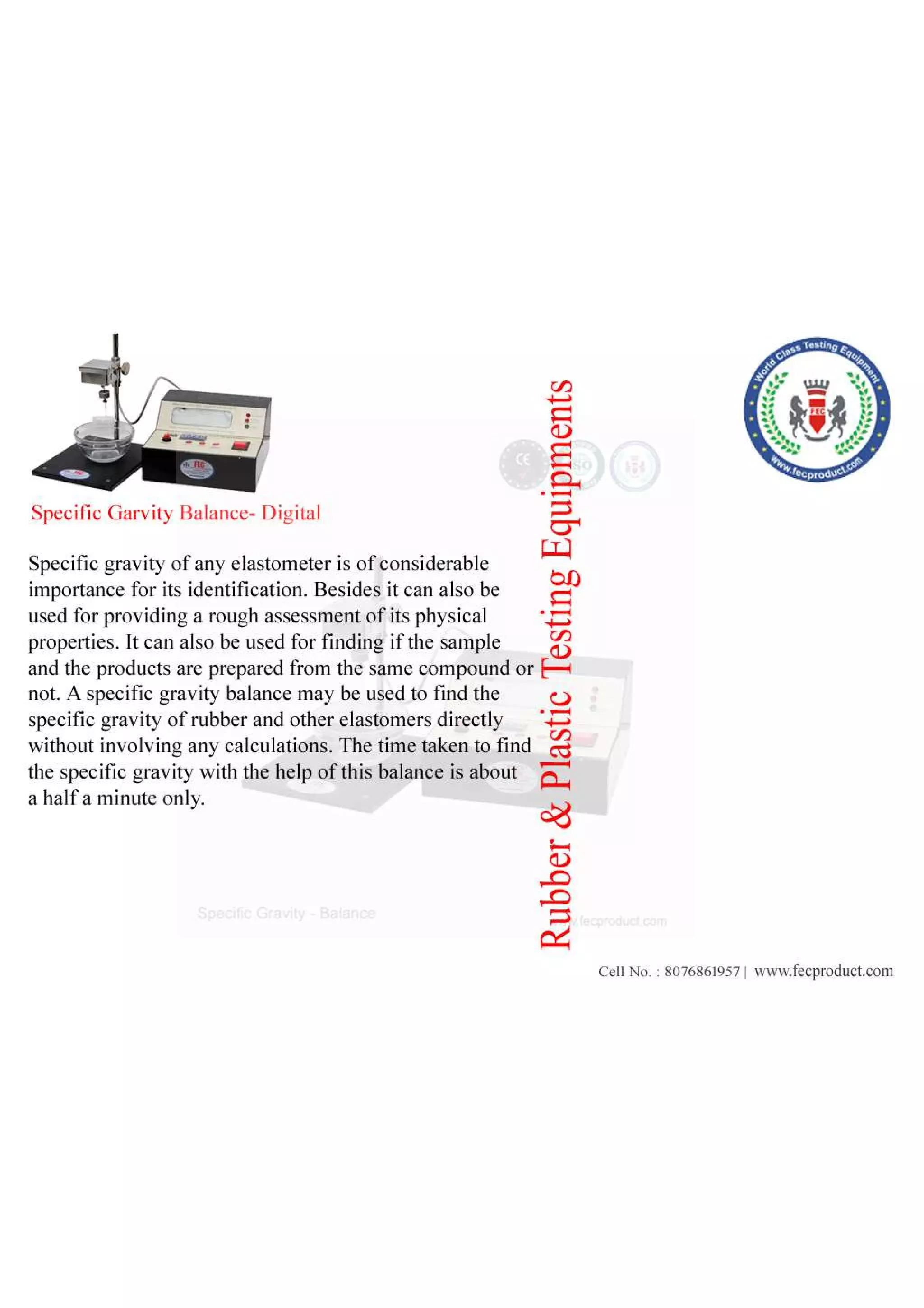 Specific gravity of any elastometer is of considerable importance for its identification. Besides it can also be used for providing a rough assessment of its physical properties. It can also be used for finding if the sample and the products are prepared from the same compound or not. A specific gravity balance may be used to find the specific gravity of rubber and other elastomers directly without involving any calculations. The time taken to find the specific gravity with the help of this balance is about a half a minute only.