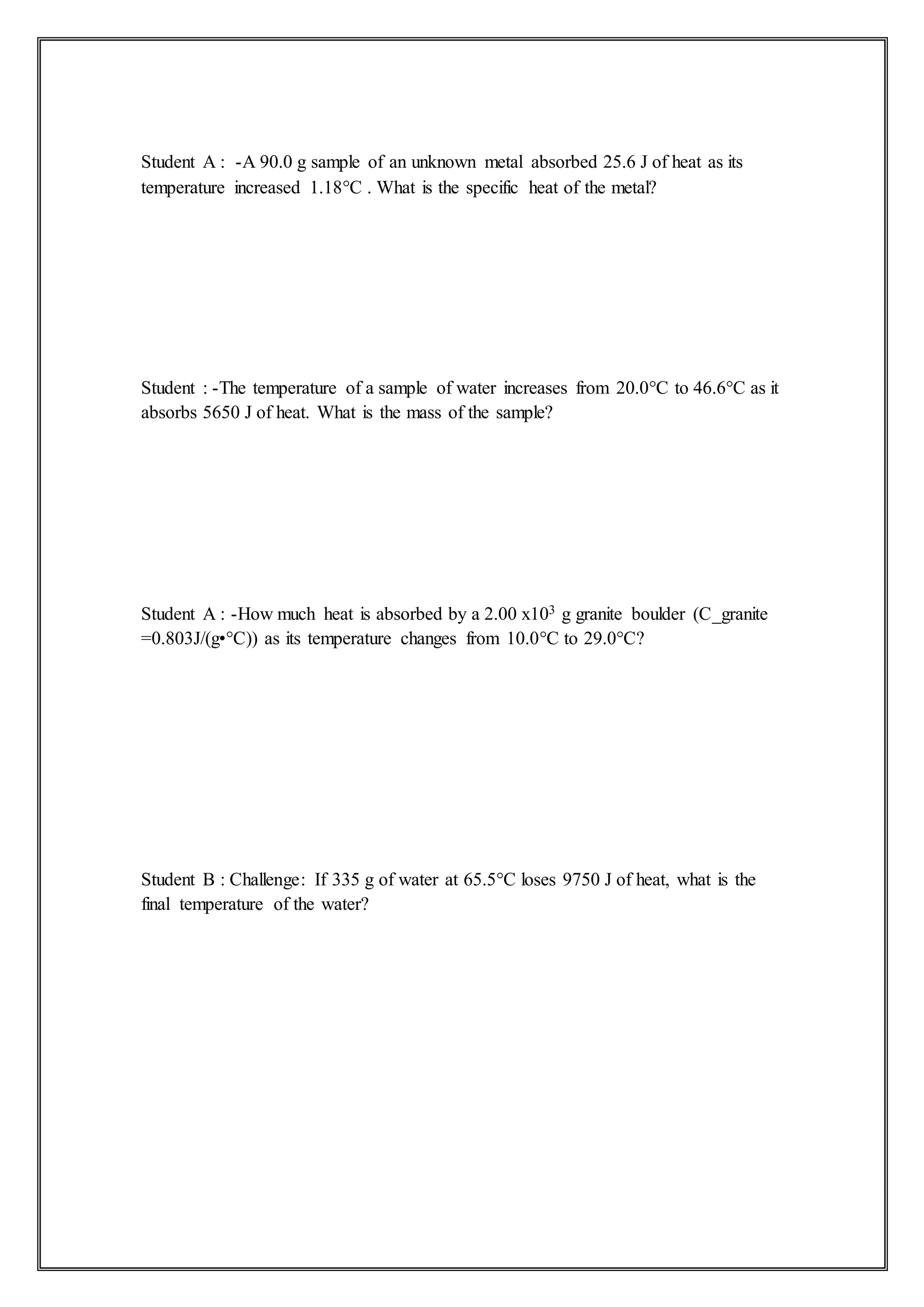 A student asks what is the specific heat of a metal that absorbed 25.6 J of heat as its temperature increased 1.18°C, given its mass was 90.0 g. Another student asks what is the mass of a water sample that absorbed 5650 J of heat and increased in temperature from 20.0°C to 46.6°C. A third student asks how much heat would be absorbed by a 2.00 kg granite boulder with a specific heat of 0.803 J/(g°C) as its temperature changes from 10.0°C to 29.0°C. A final student asks for the final temperature of 335 g of water that lost 9750 J of heat, given its