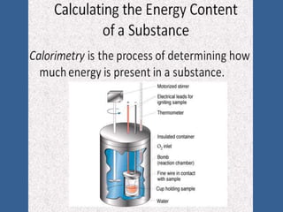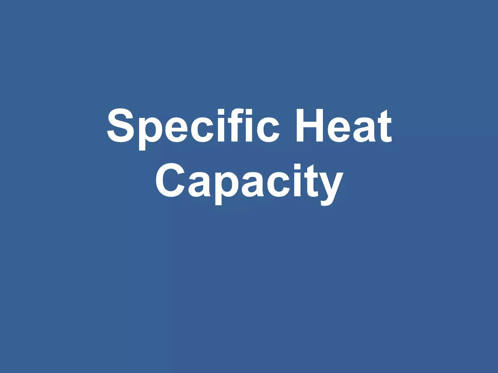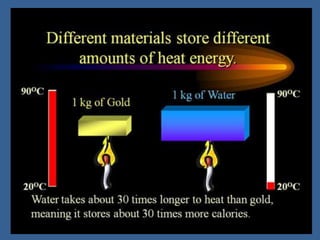 This document discusses specific heat capacity and how it relates to heat transfer and temperature change. Specific heat capacity is the amount of heat required to raise the temperature of 1 gram of a substance by 1 degree Celsius. Water has a relatively high specific heat of 4.184 J/g°C, while other substances like aluminum (0.897 J/g°C) and iron (0.449 J/g°C) have lower specific heat capacities. The specific heat capacity of a substance determines how quickly or slowly it will heat up when heat is added. The document also provides an equation to calculate the heat absorbed or released given the specific heat, mass, and temperature change of a substance.