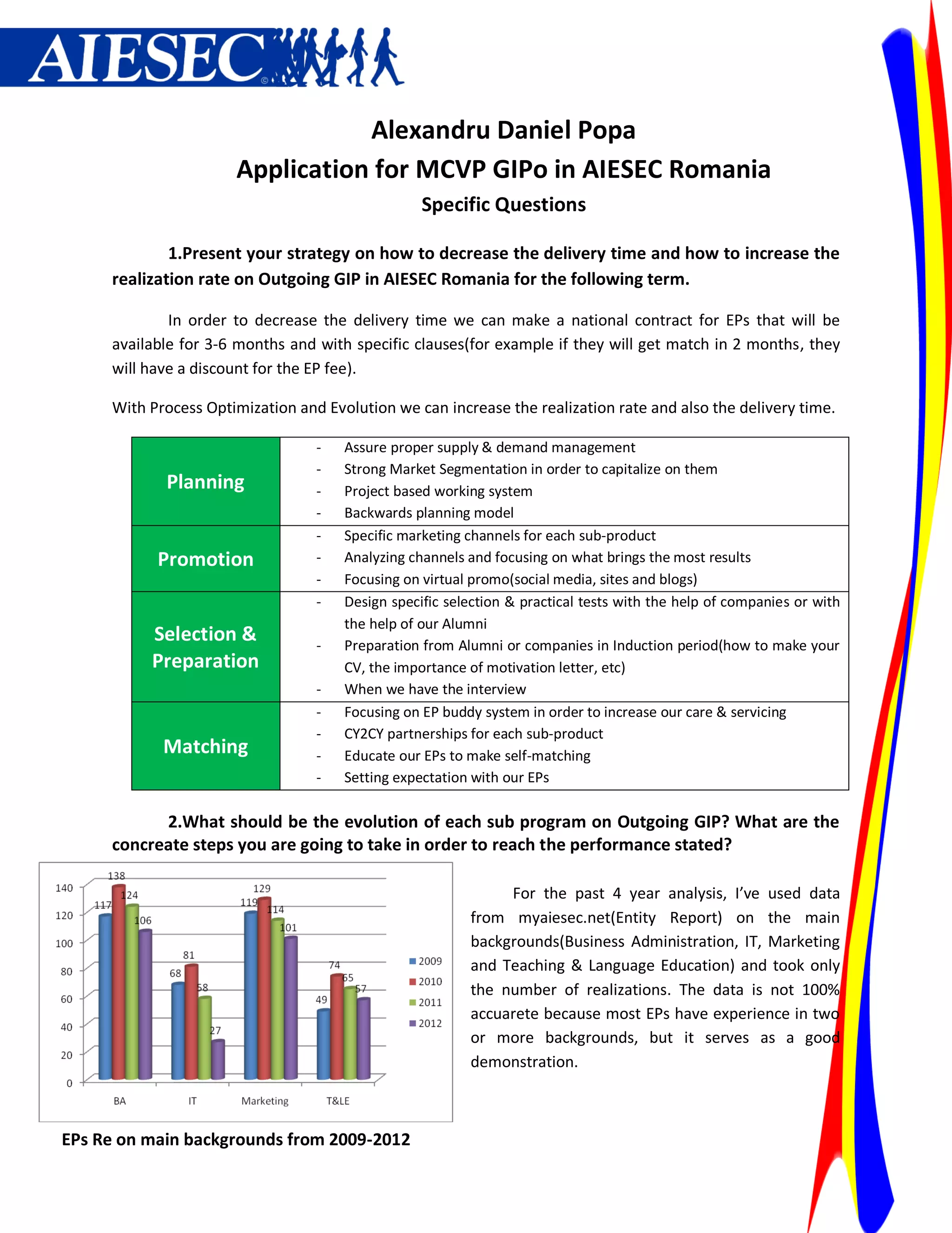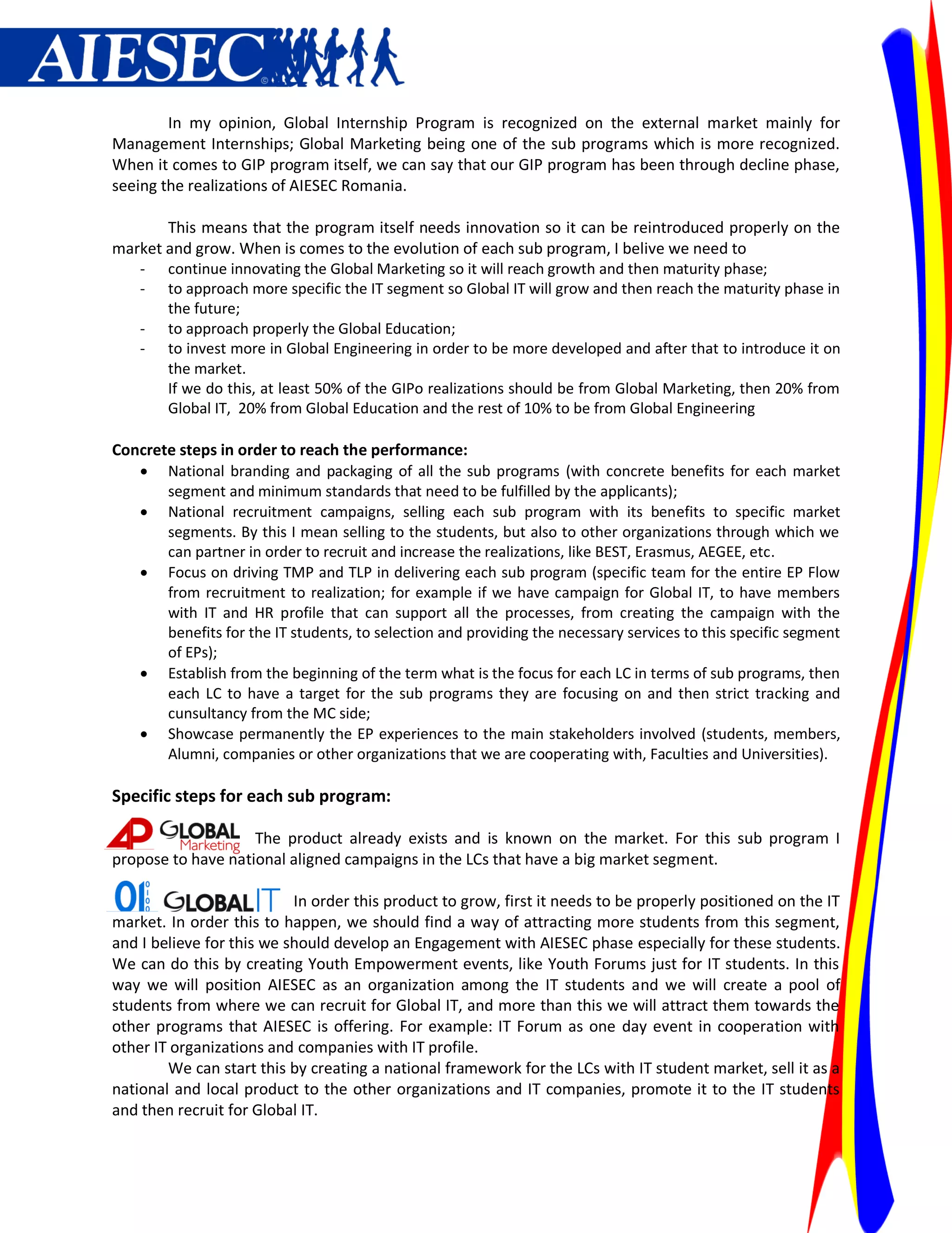 The document discusses strategies to improve AIESEC Romania's outgoing Global Internship Program (GIPo). It analyzes past performance and identifies bottlenecks. Key strategies proposed to address bottlenecks and achieve objectives include: 1) focusing marketing and project management on specific sub-programs; 2) improving collaboration between areas; 3) providing localization support and education; 4) enhancing EP selection, matching and servicing; and 5) developing sales capabilities for recruitment teams. The goal is to increase quality and quantity of GIPo realizations through constant growth.