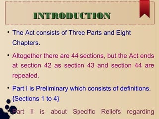 The Specific Relief Act, 1963, with amendments in 2018, outlines procedures for the enforcement of civil rights and the granting of specific reliefs through its three parts and 44 sections. Key provisions include rules on dispossession of immovable property, specific performance of contracts, and remedies available for breach of contract, with significant emphasis on the non-granting of injunctions regarding infrastructure projects. The act also covers contractual obligations, declaratory decrees, temporary and perpetual injunctions, as well as provisions for rectification and rescission of contracts.