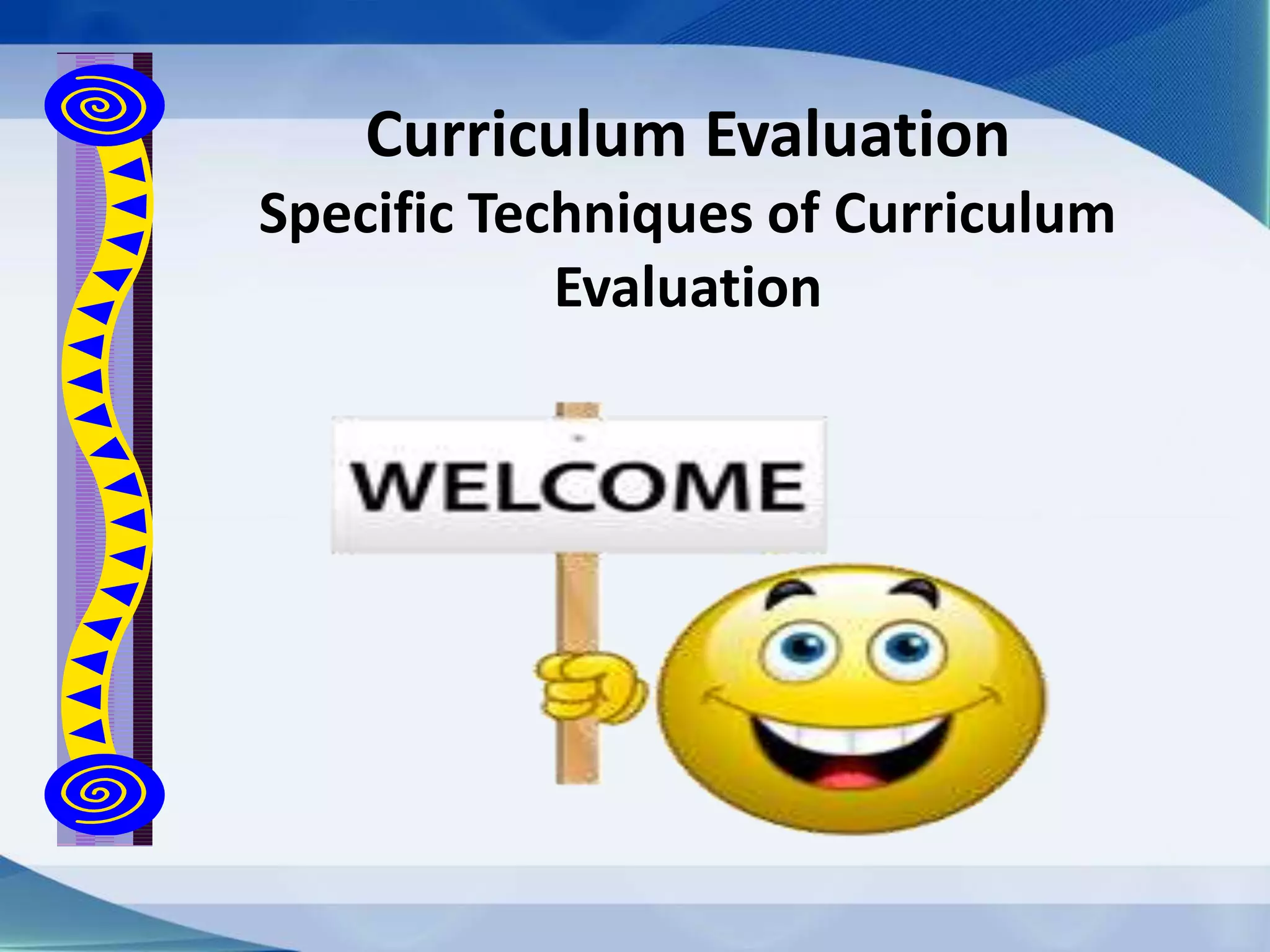 This document discusses specific techniques for evaluating curriculum, including: