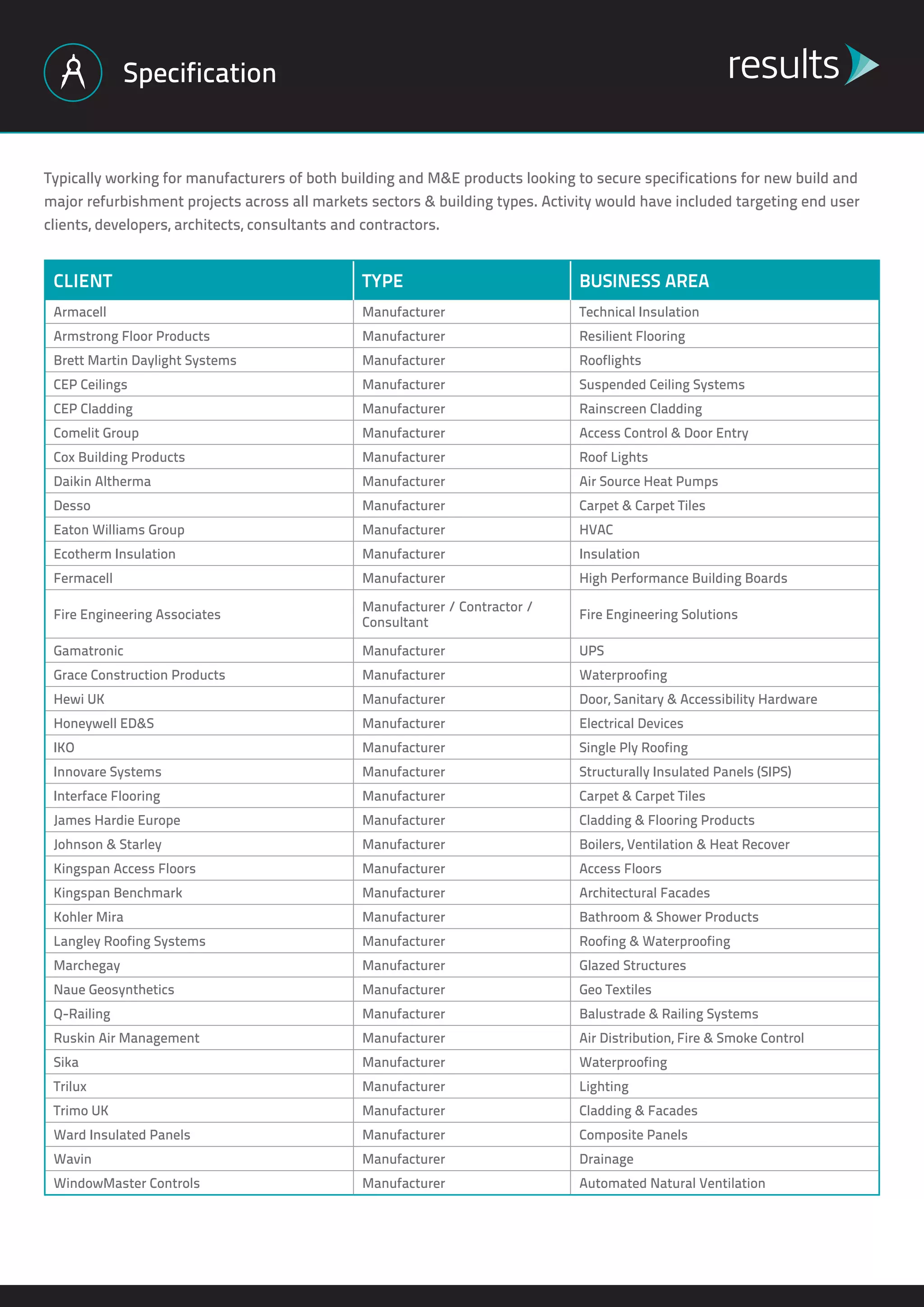 The document describes a role that typically works with manufacturers of building and mechanical and electrical products to secure product specifications for new construction and major renovation projects across all market sectors and building types. This would involve targeting end users, developers, architects, consultants, and contractors. It then lists several manufacturers and the types of products or services they provide.