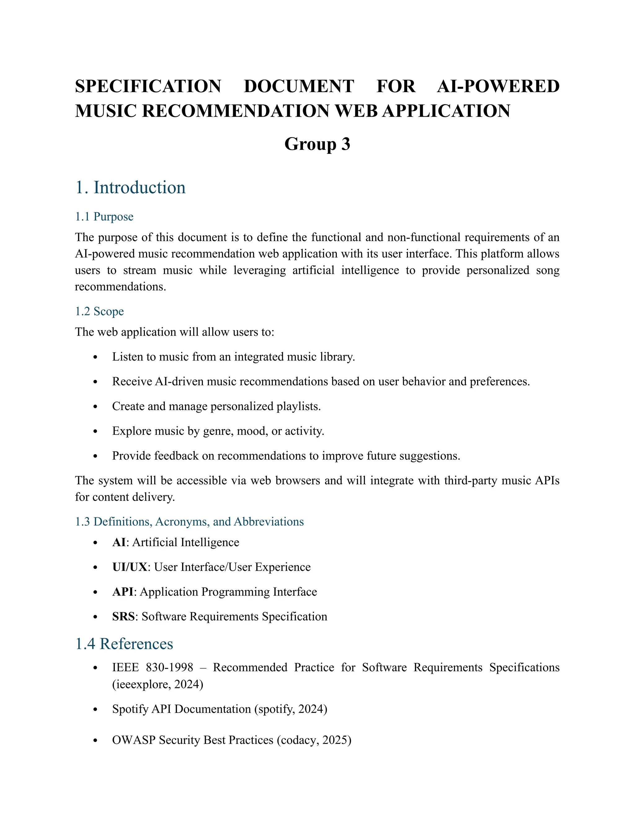 Spotify, YouTube Music) to provide music streaming and AI-driven recommendations. It will be
