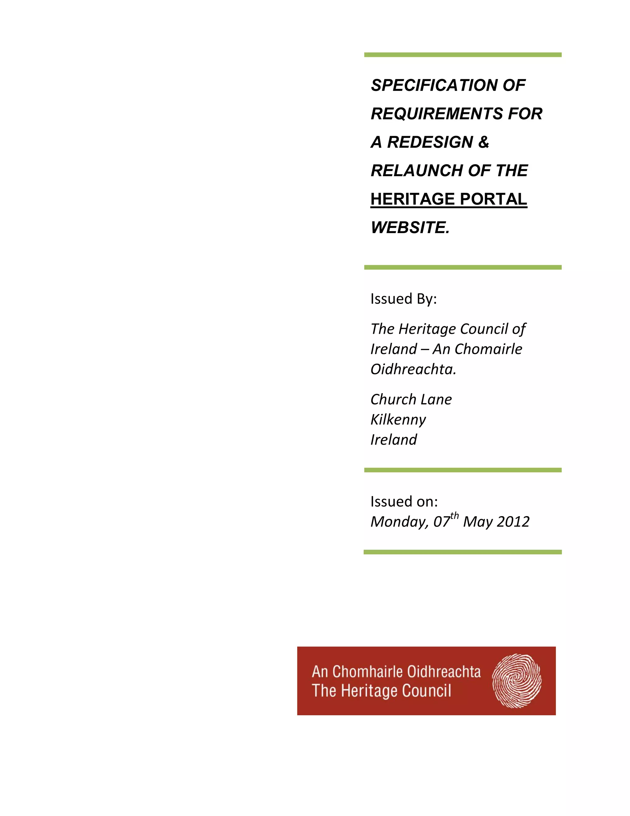 The Heritage Council of Ireland is seeking proposals for the redesign and relaunch of the heritage portal website to enhance design, user-friendliness, and search engine optimization while facilitating user-driven content creation. The project aims to improve the website's functionality, branding, and overall appeal, ensuring it serves as a key resource for cultural heritage professionals in Europe. Interested web development firms are invited to submit tenders by May 18, 2012, outlining their strategies and associated costs.