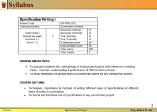 This document appears to be notes from Lecture 1 of Specification Writing-I, taught by Eng. Kishor K. Ade. It covers various topics like the course syllabus, principles of working drawings, introduction, preparation of start drawings, foundation systems and plans, floor systems and plans. The notes are broken into several sections and pages with headings and content indicating the lecture covered multiple structural and technical aspects of specification writing.