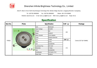 Shenzhen Infinite Brightness Technology Co., Limited is a manufacturer and seller of LED lighting products. They provide specifications for MR16, PAR20, PAR30, and 30W/40W downlight LED products. Their products use Nichia LEDs and have a lifespan of 30,000-50,000 hours. They provide a 3 year warranty and certifications include CE, RoHS, and FCC.