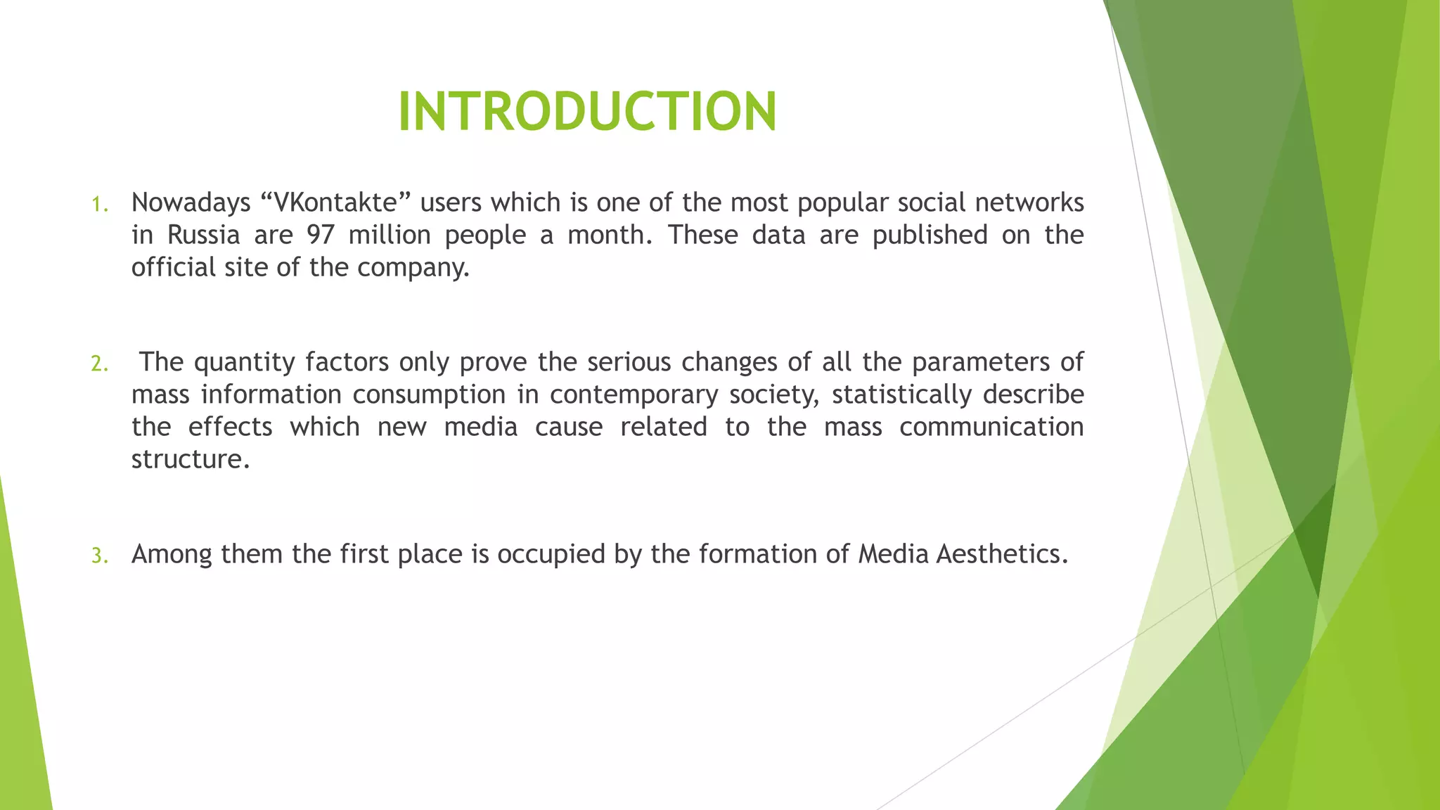 This document discusses multimedia texts in social networks and media aesthetics. It begins by noting that 97 million people in Russia use VKontakte each month. New media is changing how mass communication works by forming media aesthetics - both how aesthetic values are interpreted in media culture and how communication is constructed using multimedia. Multimedia texts on social networks combine different sign systems like text, pictures, audio and video. Users learn to communicate and create complex multimedia texts through practices like language play, precedents, irony and collages. A case study analyzed two news messages on VKontakte about an expedition, finding the multimedia one was more engaging and interactive for users. The conclusion is that multimedia texts are native to media aesthetics and social
