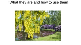 Specimen trees are trees that are particularly beautiful or interesting and deserve center stage in a garden. Features like unusual bark, branching, flowers, or fall color can make a tree worthy of being a specimen tree. When planting a specimen tree, consider what size tree the space can accommodate and what season(s) it will provide interest. Pairing trees with different seasons of interest can provide year-round visual appeal. The document then provides descriptions of various tree species that would make good specimen trees, including their size, growth rate, and tolerances.
