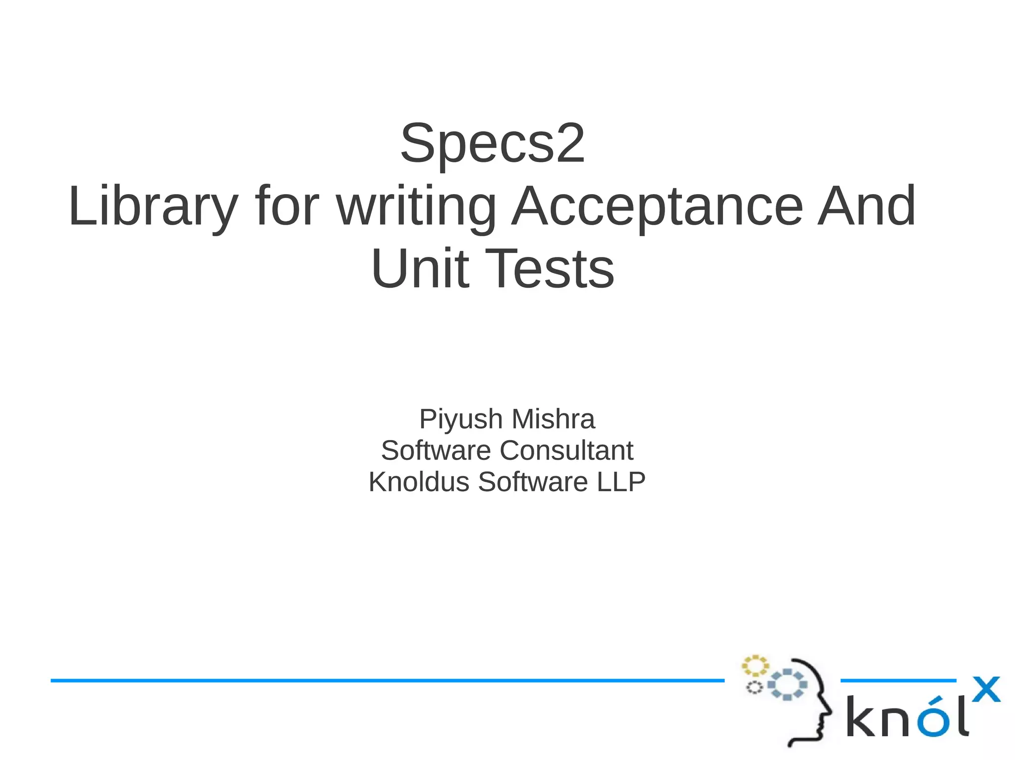Specs2 is a Scala library for writing acceptance and unit tests. It uses a domain specific language (DSL) approach based on behavior-driven development (BDD). Specs2 specifications are structured, immutable, and control dependencies. Unit specs extend Specification and are mutable, while acceptance specs extend Specification and are functional. Specs2 provides matchers, mock objects, and forms to make assertions in tests. Tests can be run with JUnit or from SBT with different output formats.