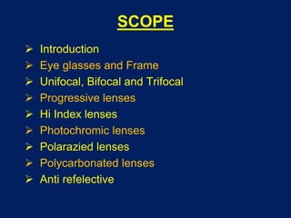 This document discusses various types of lenses and coatings used in eyeglasses. It describes unifocal lenses that provide single vision correction and multifocal lenses like bifocals and trifocals that correct for both distance and near vision. Progressive lenses provide a seamless transition between vision corrections. Hi-index and lightweight lenses reduce thickness. Photochromic lenses darken in sunlight and clear in low light. Polarized and tinted lenses reduce glare. Polycarbonate lenses are impact resistant. Anti-reflective coatings improve vision clarity and comfort.