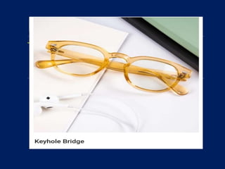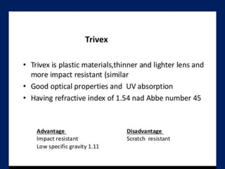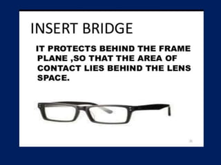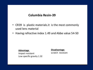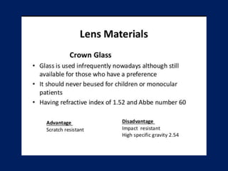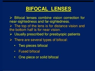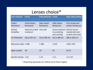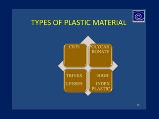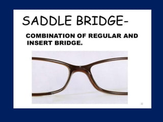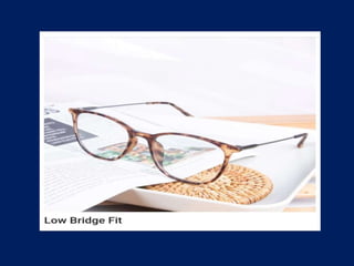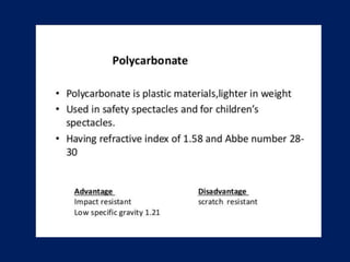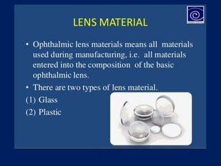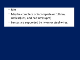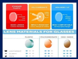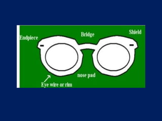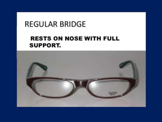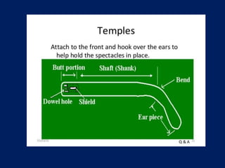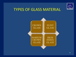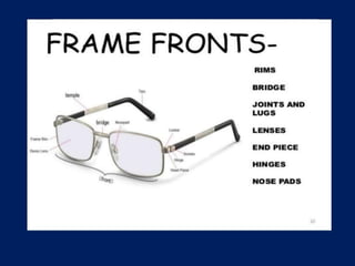 Spectacles consist of lenses held in a frame that extends towards the ears. The frame holds the lenses and comes in various materials like plastic, metal, and nylon. Lenses can be made of glass or plastics like CR-39, polycarbonate and Trivex. Lens forms include flat lenses, curved lenses like meniscus and toric lenses. Spectacles can be single vision, bifocal, trifocal or progressive. Additional lens features include coatings like anti-reflective, scratch-resistant, UV and photochromic coatings.