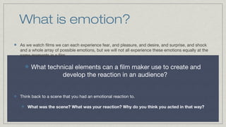Filmmakers aim to elicit emotional responses from audiences. However, individuals may experience different emotions to the same film due to personal experiences and social/cultural backgrounds. While some shared responses are possible within social or ideological groups, each person brings private memories and desires to their viewing experience.
