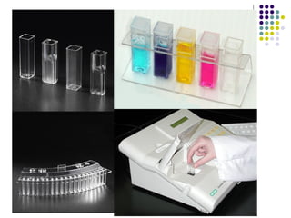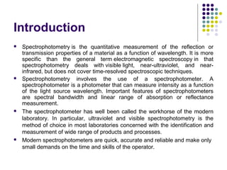 Spectrophotometry involves using a spectrophotometer to measure how much light is absorbed or transmitted by a sample at different wavelengths. It is commonly used to determine the concentration of known substances in solution. A spectrophotometer works by shining light through a sample and measuring the intensity of the transmitted light, then using Beer's Law to calculate absorbance from transmittance. Absorbance measurements at different concentrations can be used to generate a standard curve to determine the concentration of unknown samples. Spectrophotometers are versatile tools that are widely used in laboratory analysis across various industries.