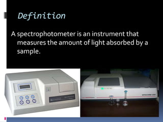 A spectrophotometer measures the amount of light absorbed by a sample. Early models took weeks for results and were only 25% accurate. In 1940, Arnold Beckman invented the first modern spectrophotometer, the Beckman DU, which provided results within minutes that were 99.99% accurate. A spectrophotometer uses a light source, dispersion devices like prisms or filters, sample cells, detectors, and a display. It is used to identify compounds and determine absorbance and transmission of light in chemistry.