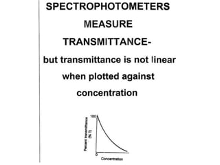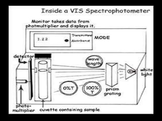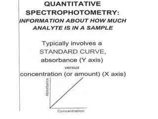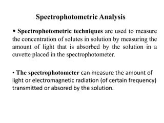 The document provides a detailed overview of spectrophotometry and its applications in measuring solute concentration in solutions by analyzing light absorption. It discusses the properties of electromagnetic radiation, the interaction of light with matter, different types of spectrophotometers, and the methods for detecting molecules. Additionally, it highlights the significance of constructing standard curves for determining unknown concentrations based on absorbance data.