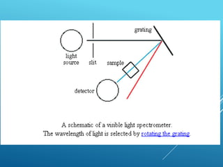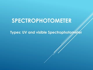 A spectrophotometer uses monochromatic light to measure the absorbance of light by a sample, allowing identification and quantification of compounds. It works by passing light through a sample and measuring the intensity of transmitted light, using this to determine concentration according to the Beer-Lambert law. Key components include a light source, monochromator, sample cuvettes, and detectors, and it has various applications in qualitative and quantitative analysis of proteins, nucleic acids, and other biological compounds.