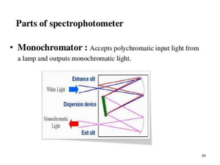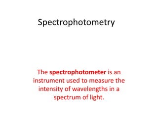 1. A spectrophotometer is an instrument that measures the intensity of light at different wavelengths absorbed by a sample. It uses a monochromator to select specific wavelengths and a detector such as a phototube to measure the intensity of transmitted light.