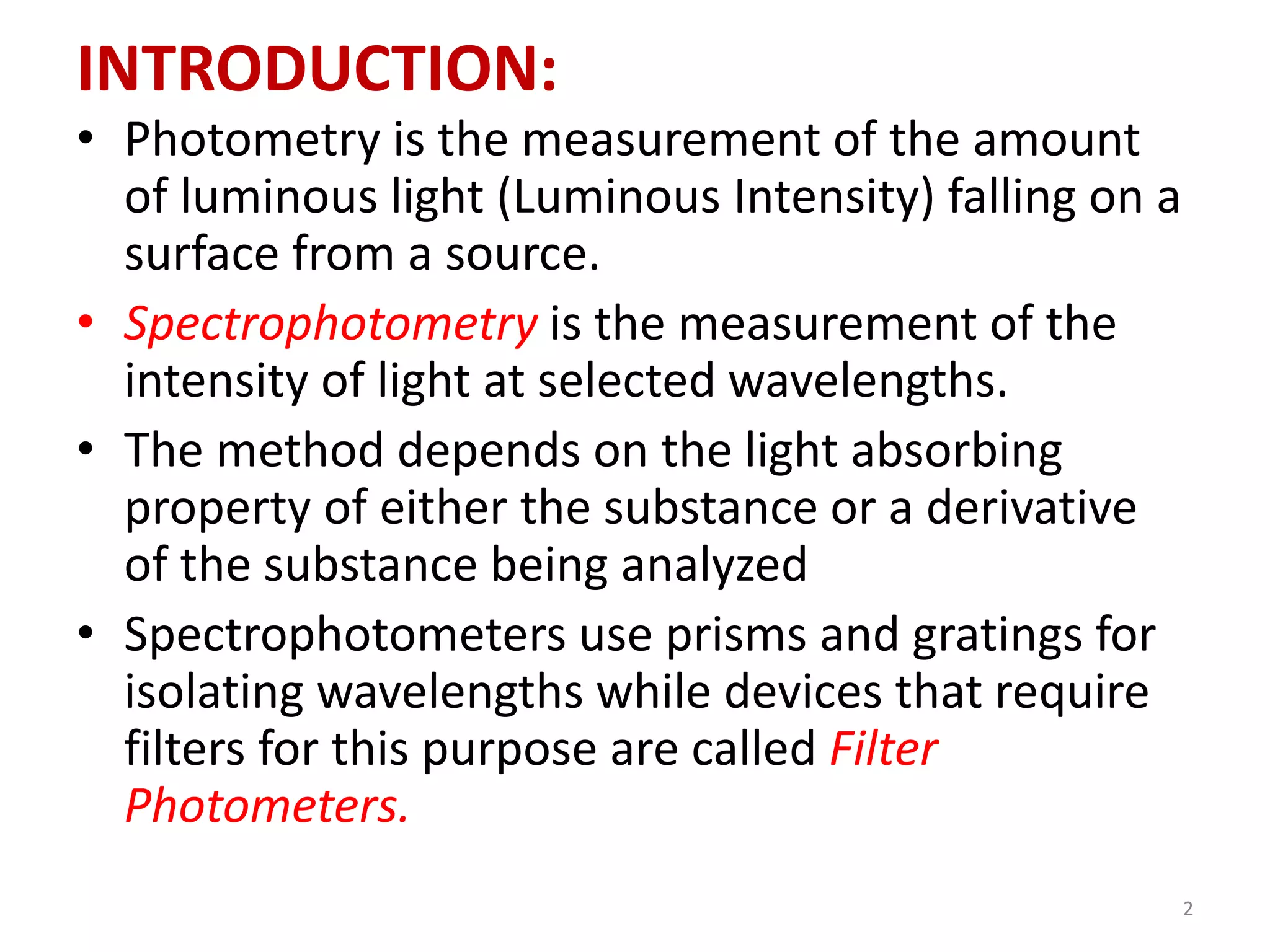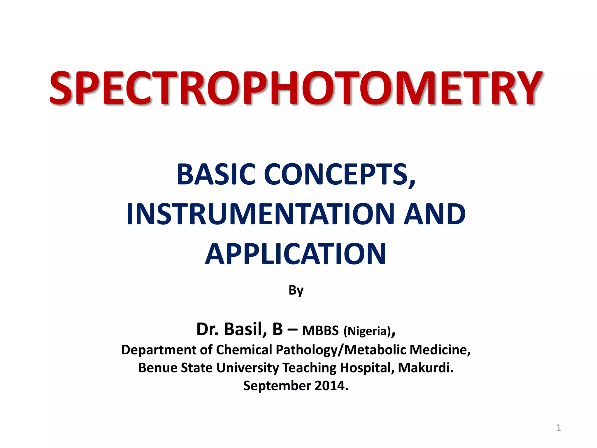 This document provides an overview of spectrophotometry, including basic concepts, instrumentation, and applications. It describes how spectrophotometers work by isolating specific wavelengths of light and measuring their absorption by a sample. The key relationship discussed is Beer's Law, which states that absorbance is directly proportional to concentration. Instrumentation components are also outlined, including light sources, monochromators for selecting wavelengths, and various methods for spectral isolation like filters, prisms and diffraction gratings.