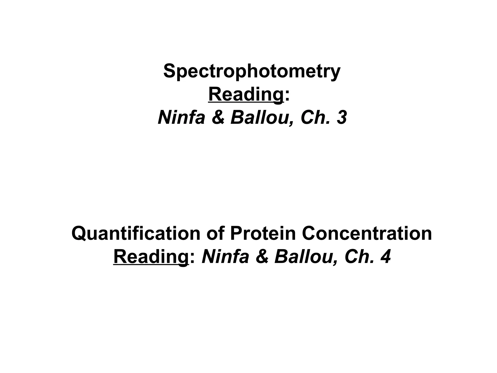 This document discusses spectrophotometry techniques for measuring light absorption by molecules. It covers the electromagnetic spectrum, Beer-Lambert law, applications of UV-vis spectroscopy like determining cell density and protein concentration, and methods for measuring absorbance of molecules like DNA, RNA, proteins, and other biological compounds. Key concepts explained include the relationship between absorbance, molar extinction coefficient, concentration, and path length in the Beer-Lambert law.