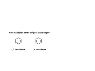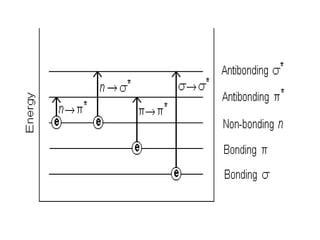 The document outlines the principles and techniques of various spectrometric methods used for chemical analysis, including UV-visible spectroscopy, infrared spectroscopy, mass spectrometry, and nuclear magnetic resonance spectroscopy. It describes the interaction of organic molecules with electromagnetic radiation, explaining concepts such as electronic transitions, absorption processes, and the calculation of the index of hydrogen deficiency for structural determination. Additionally, it provides details on instrumentation, the Beer-Lambert law, and different types of electronic transitions relevant to spectroscopic studies.