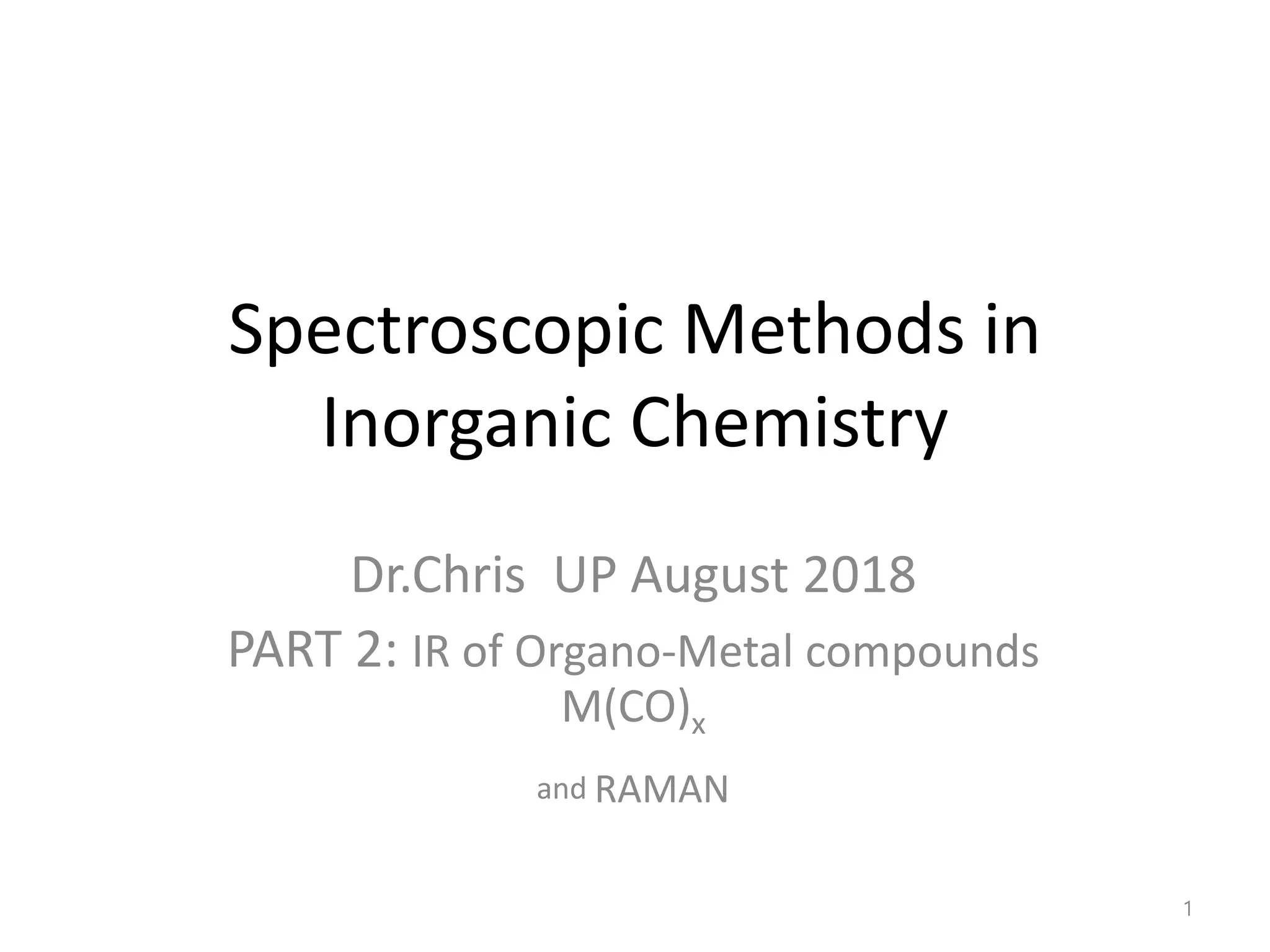 This document discusses spectroscopic methods for analyzing organometallic compounds, focusing on IR and Raman spectroscopy of metal carbonyl complexes. It explains that the C-O stretching wavenumbers in metal carbonyl complexes shift to lower values when there is more back-bonding from the metal to the carbonyl π* orbitals. The number of IR peaks expected for related complexes can be determined from the point group and character tables. It also briefly mentions using IR, Raman, UV-Vis, and NMR spectroscopy to study other types of inorganic complexes.