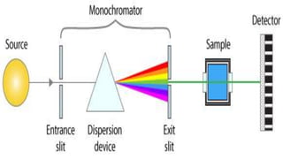 Spectroscopy is the study of the interaction between electromagnetic radiation and matter. A spectrometer is used to measure the presence of compounds in a molecule by analyzing the spectrum produced when matter interacts with different wavelengths of light. Absorption spectroscopy involves matter absorbing radiation and undergoing an electronic transition to a higher energy state. UV/visible spectroscopy uses this technique to study electronic transitions in atoms and molecules in the ultraviolet and visible light ranges.
