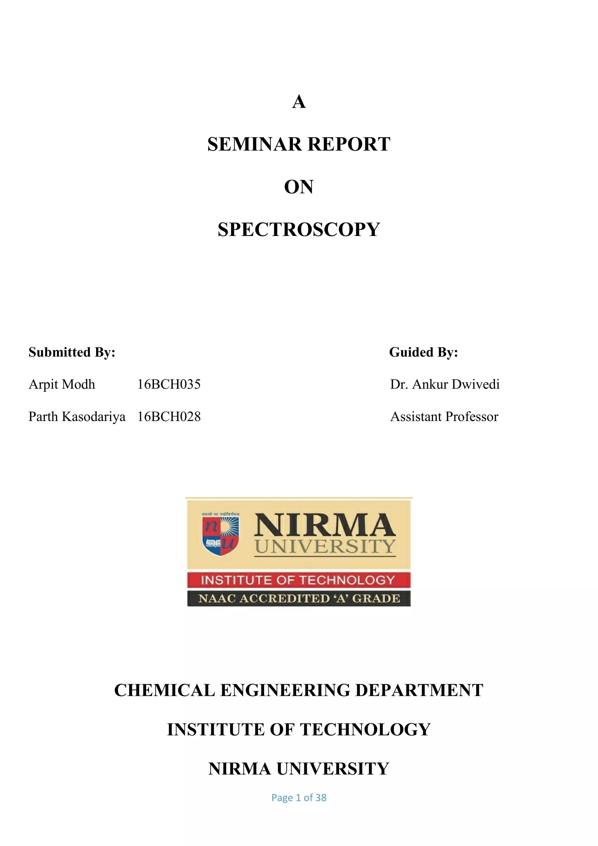 This document is a 38-page seminar report on spectroscopy submitted by two students, Arpit Modh and Parth Kasodariya. It includes an introduction to spectroscopy, descriptions of various spectroscopy techniques like atomic absorption spectroscopy, infrared absorption spectroscopy, and ultraviolet-visible spectroscopy. The report covers principles, instrumentation, applications, and more for different spectroscopy methods. It aims to provide a basic review of spectroscopy and its uses in various important fields like structure analysis.